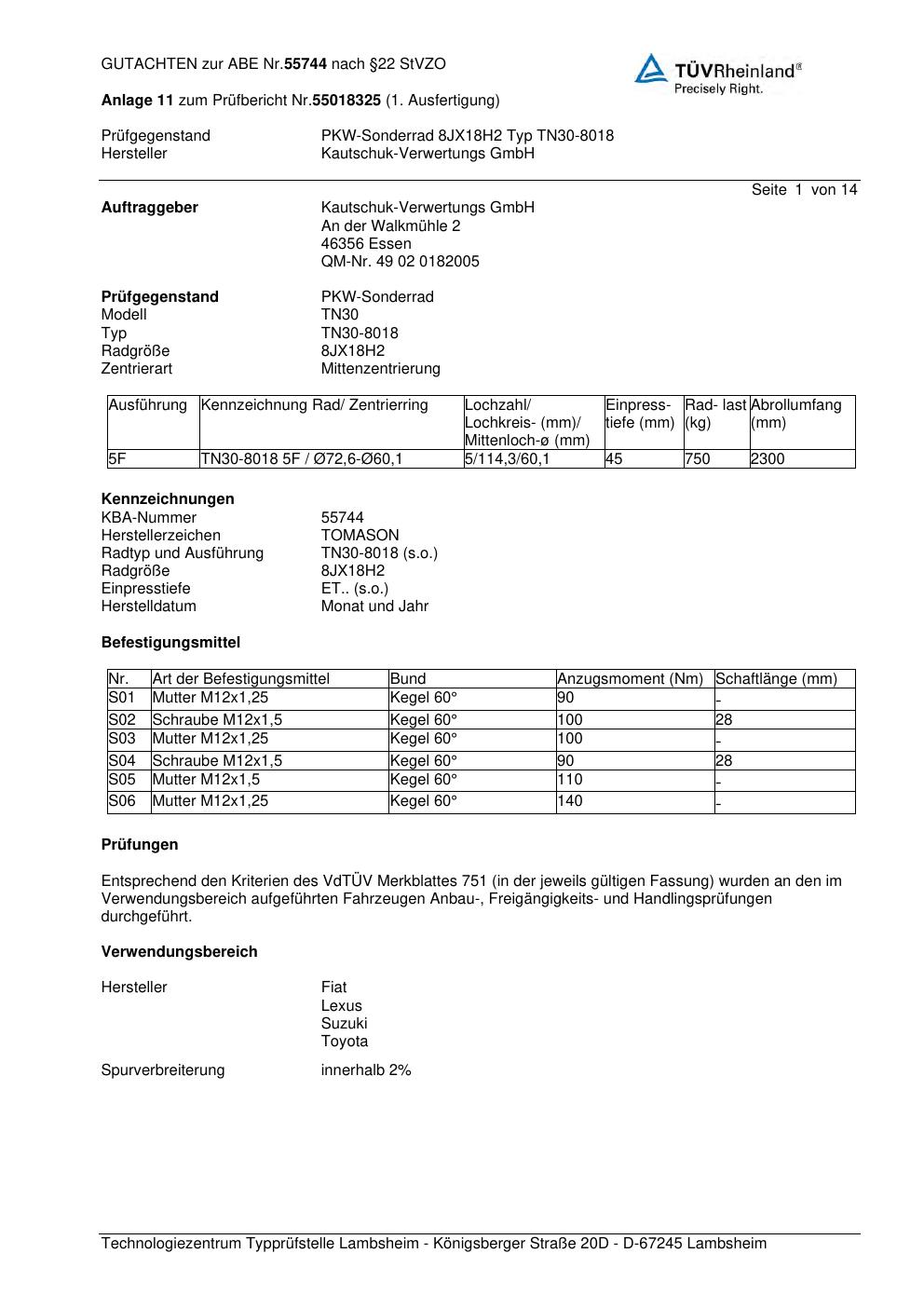 Dieses Gutachten (abe) bezieht sich auf die Alufelge Kautschuk-Verwertungs GmbH TN30-8018 in der Ausführung ET 0, Mittenloch 0 mm (KBA 55744). Im PDF findest du typischerweise zulässige Reifengrößen, Auflagen/Anbauhinweise und – je nach Dokument – Hinweise zur Eintragung.