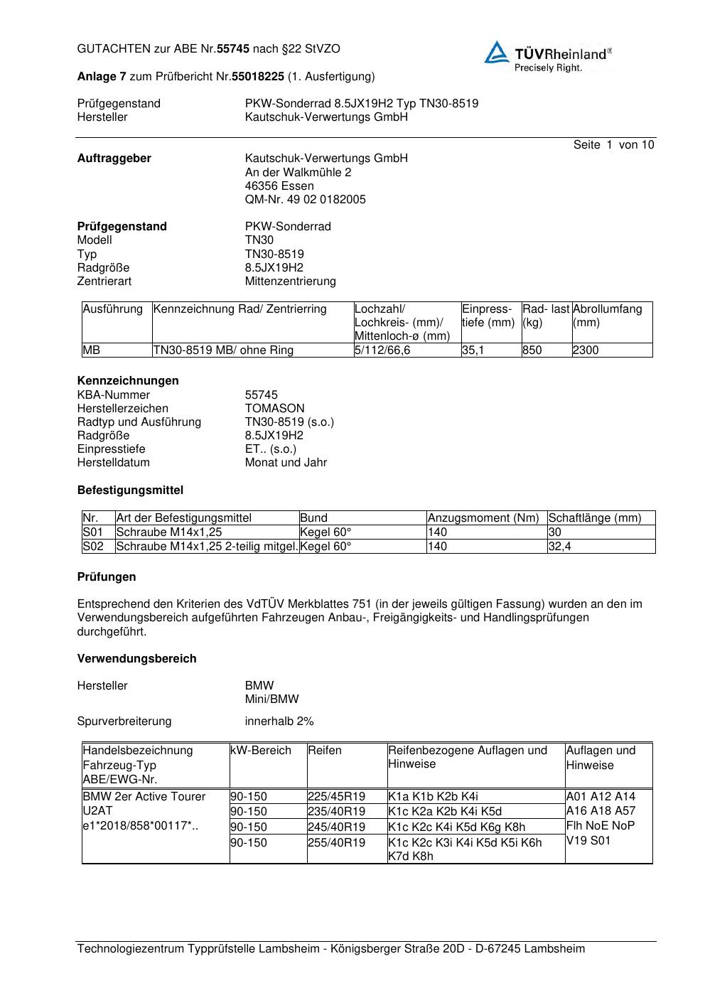 Dieses Gutachten (abe) bezieht sich auf die Alufelge Kautschuk-Verwertungs GmbH TN30-8519 in der Ausführung ET 0, Mittenloch 0 mm (KBA 55745). Im PDF findest du typischerweise zulässige Reifengrößen, Auflagen/Anbauhinweise und – je nach Dokument – Hinweise zur Eintragung.