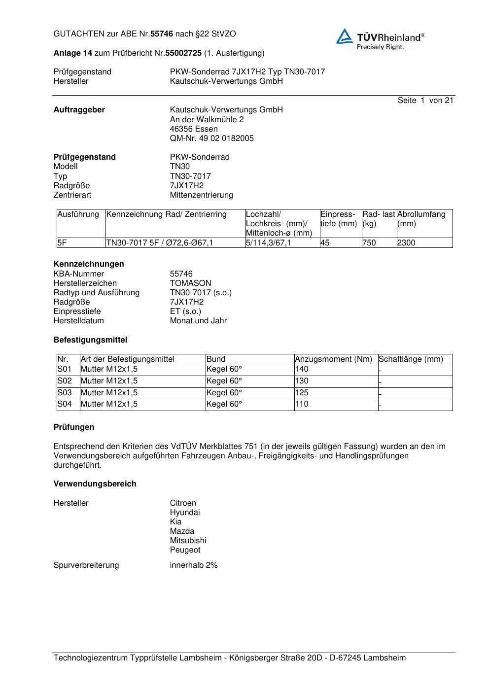 Dieses Gutachten (abe) bezieht sich auf die Alufelge Kautschuk-Verwertungs GmbH TN30-7017 in der Ausführung ET 0, Mittenloch 0 mm (KBA 55746). Im PDF findest du typischerweise zulässige Reifengrößen, Auflagen/Anbauhinweise und – je nach Dokument – Hinweise zur Eintragung.
