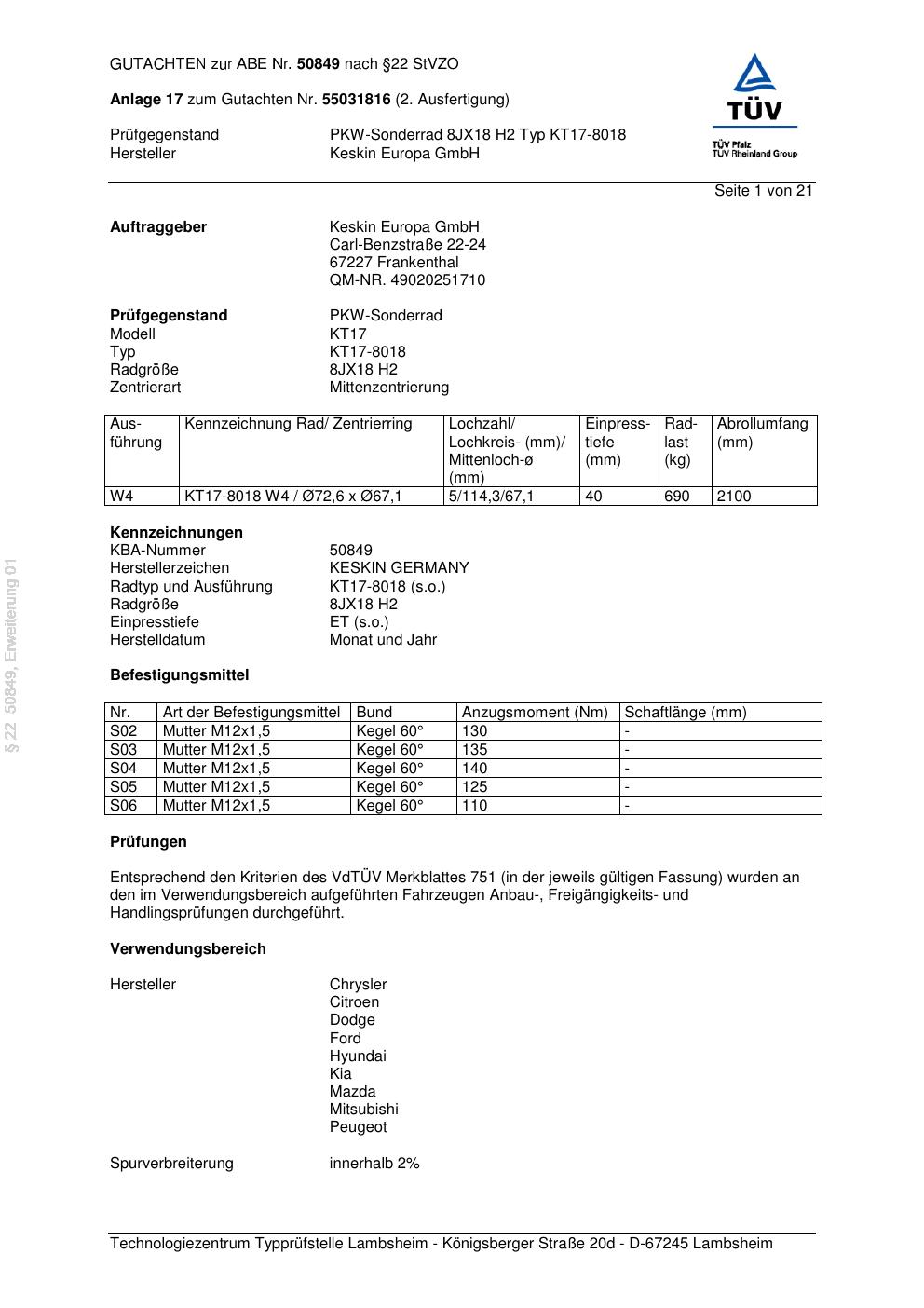 Dieses Gutachten (abe) bezieht sich auf die Alufelge Keskin KT17-8018 in der Ausführung ET 0, Mittenloch 0 mm (KBA 50849). Im PDF findest du typischerweise zulässige Reifengrößen, Auflagen/Anbauhinweise und – je nach Dokument – Hinweise zur Eintragung.