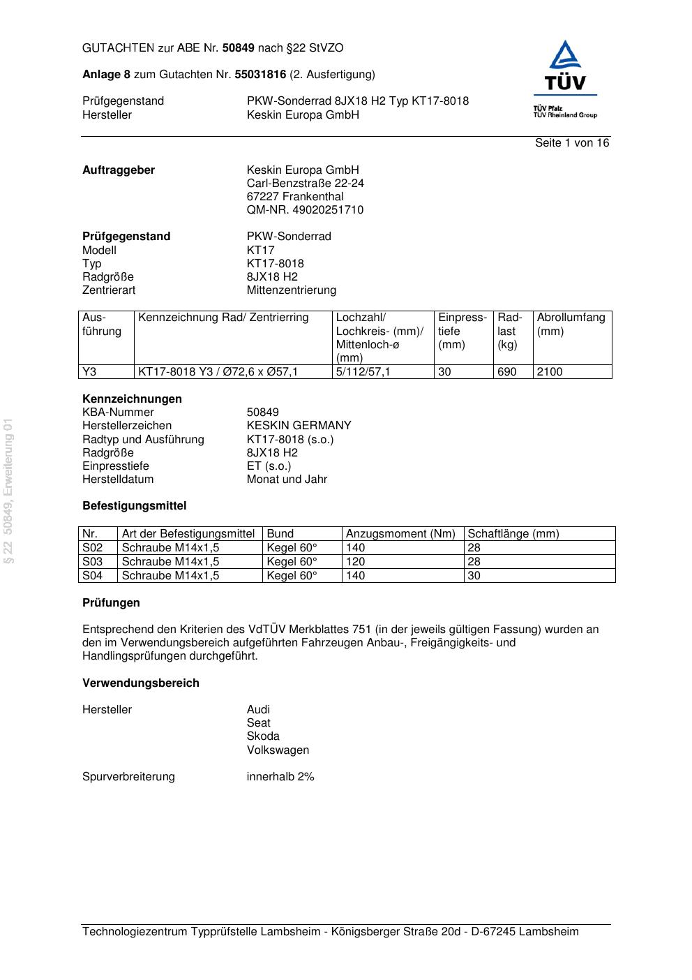 Dieses Gutachten (abe) bezieht sich auf die Alufelge Keskin Europa GmbH KT17-8018 in der Ausführung ET 0, Mittenloch 0 mm (KBA 50849). Im PDF findest du typischerweise zulässige Reifengrößen, Auflagen/Anbauhinweise und – je nach Dokument – Hinweise zur Eintragung.