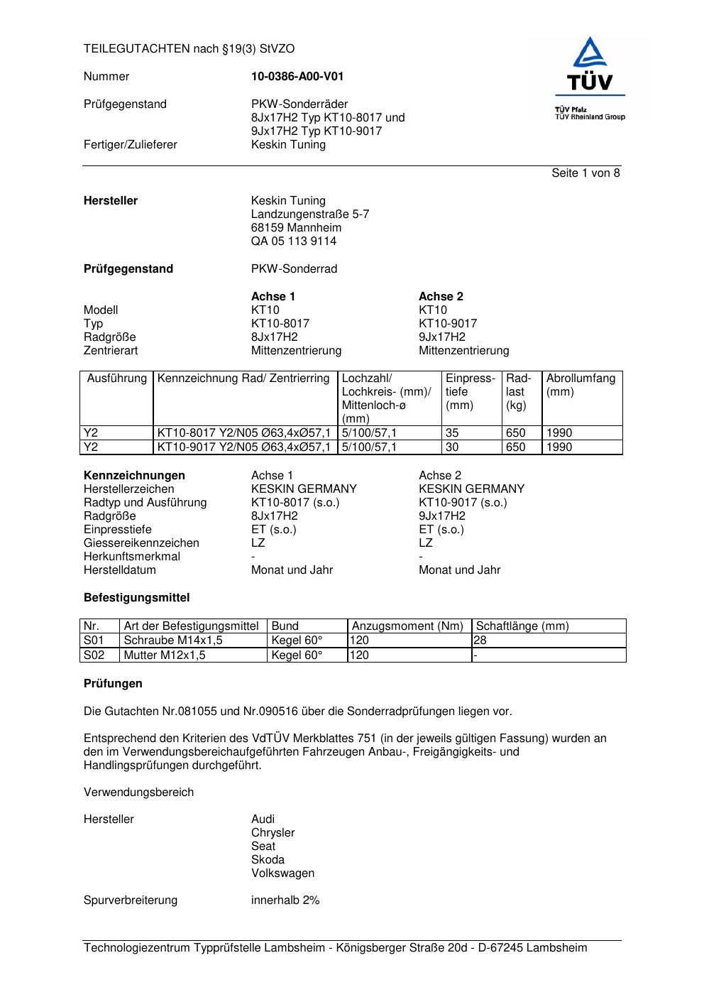 teilegutachten 10-0386-a00-v01 Keskin Tuning KT10-8017 / KT10-9017