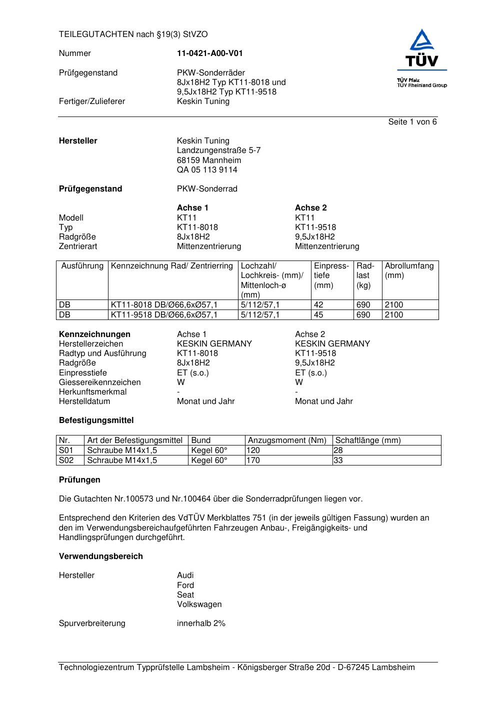 teilegutachten 11-0421-a00-v01 Keskin KT11-8018; KT11-9518
