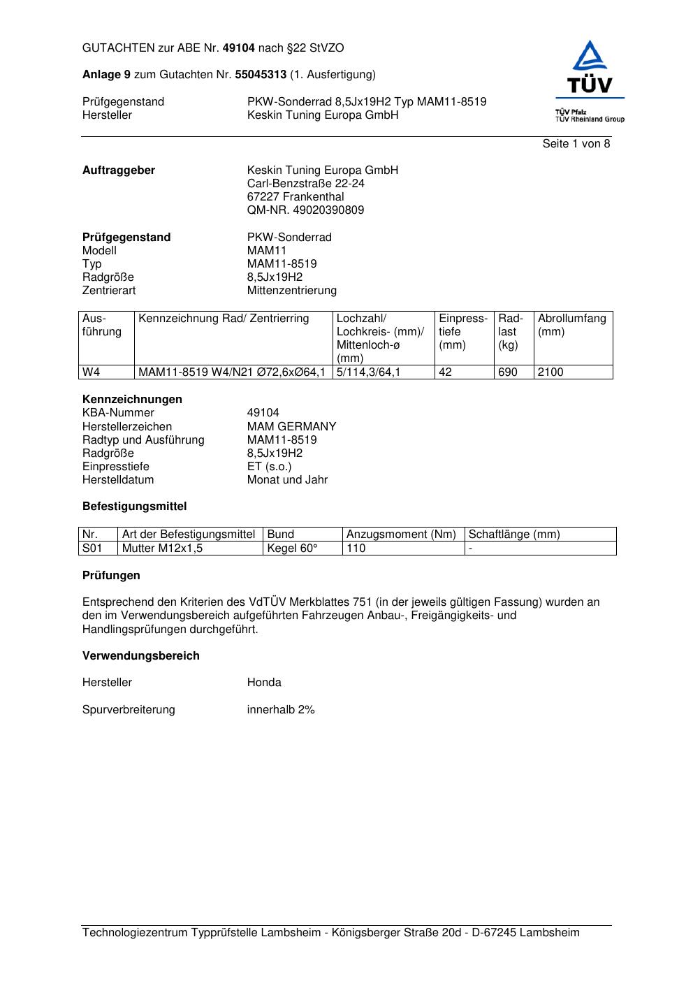 Felgengutachten / abe für Alufelgen Keskin Tuning Europa GmbH MAM11-8519 (ET 0, Mittenloch 0 mm) mit KBA 49104 (Zertifikatsnummer 49104). Hier kostenlos als PDF herunterladen. Der Download-Link ist 24 Stunden gültig und kann bis zu zwei Mal verwendet werden.