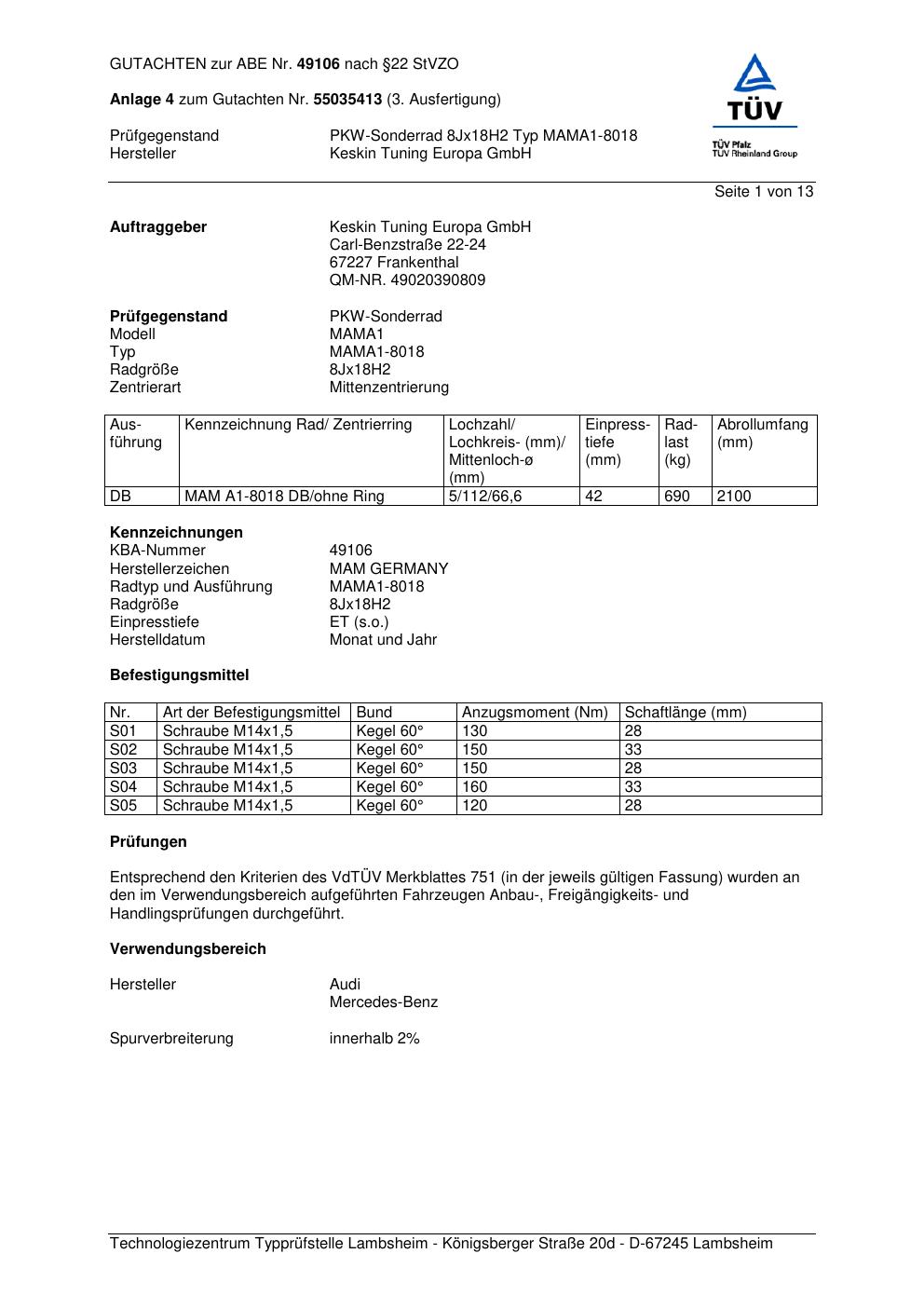 Dieses Gutachten (abe) bezieht sich auf die Alufelge Keskin Tuning Europa GmbH MAMA1-8018 in der Ausführung ET 0, Mittenloch 0 mm (KBA 49106). Im PDF findest du typischerweise zulässige Reifengrößen, Auflagen/Anbauhinweise und – je nach Dokument – Hinweise zur Eintragung.