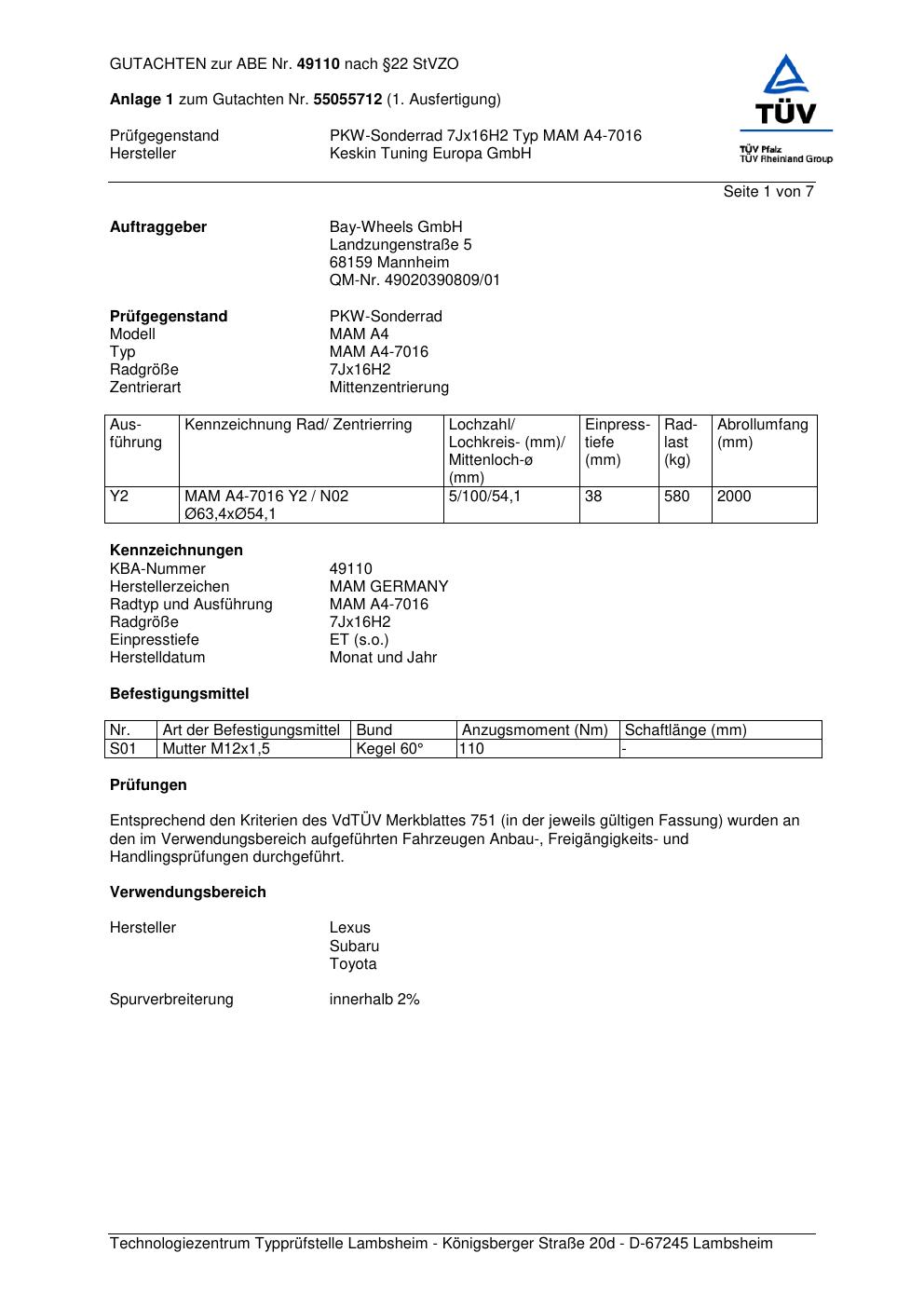 Dieses Gutachten (abe) bezieht sich auf die Alufelge Keskin Tuning Europa GmbH MAM A4-7016 in der Ausführung ET 0, Mittenloch 0 mm (KBA 49110). Im PDF findest du typischerweise zulässige Reifengrößen, Auflagen/Anbauhinweise und – je nach Dokument – Hinweise zur Eintragung.