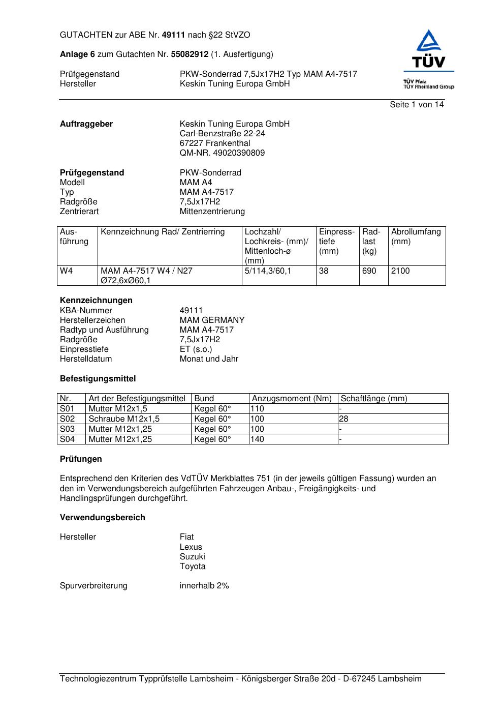 Dieses Gutachten (abe) bezieht sich auf die Alufelge Keskin MAM A4-7517 in der Ausführung ET 0, Mittenloch 0 mm (KBA 49111). Im PDF findest du typischerweise zulässige Reifengrößen, Auflagen/Anbauhinweise und – je nach Dokument – Hinweise zur Eintragung.