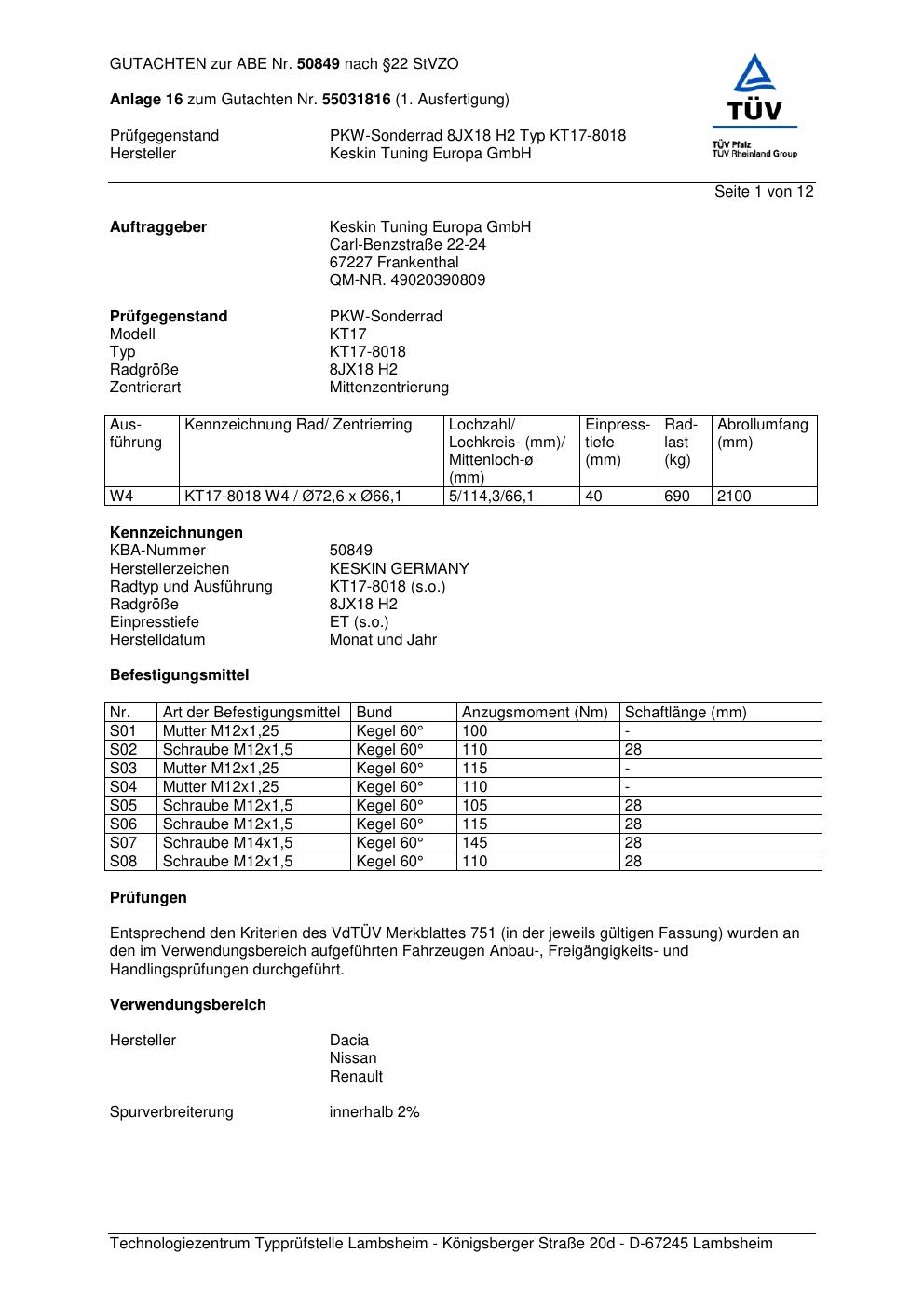 Dieses Gutachten (abe) bezieht sich auf die Alufelge Keskin KT17-8018 in der Ausführung ET 0, Mittenloch 0 mm (KBA 50849). Im PDF findest du typischerweise zulässige Reifengrößen, Auflagen/Anbauhinweise und – je nach Dokument – Hinweise zur Eintragung.