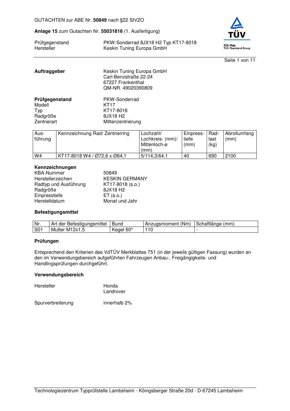 Dieses Gutachten (abe) bezieht sich auf die Alufelge Keskin KT17-8018 in der Ausführung ET 0, Mittenloch 0 mm (KBA 50849). Im PDF findest du typischerweise zulässige Reifengrößen, Auflagen/Anbauhinweise und – je nach Dokument – Hinweise zur Eintragung.