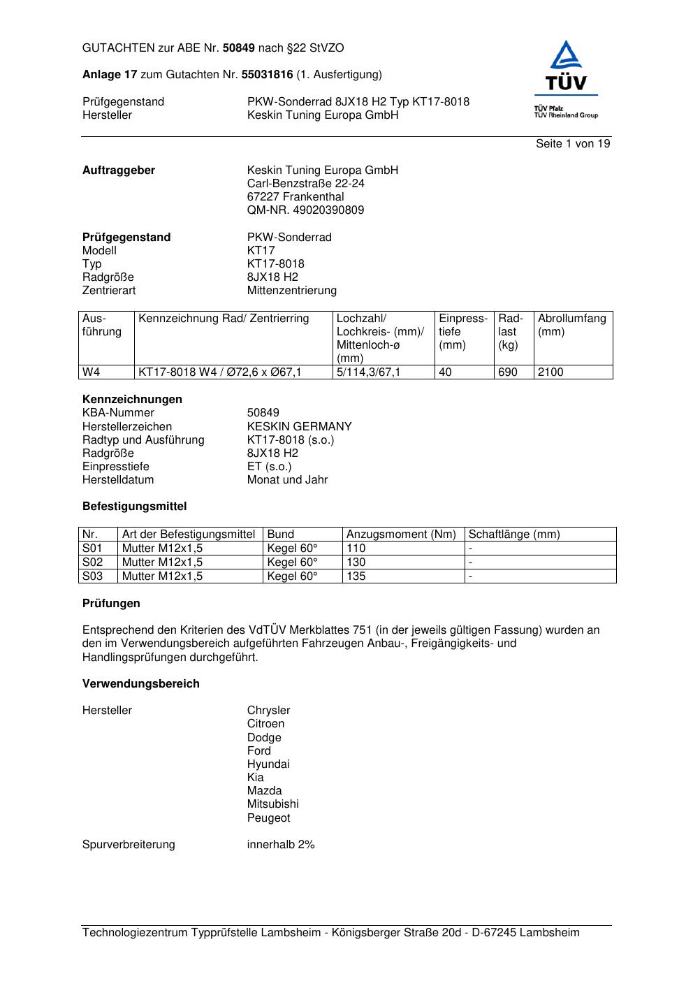 Dieses Gutachten (abe) bezieht sich auf die Alufelge Keskin KT17-8018 in der Ausführung ET 0, Mittenloch 0 mm (KBA 50849). Im PDF findest du typischerweise zulässige Reifengrößen, Auflagen/Anbauhinweise und – je nach Dokument – Hinweise zur Eintragung.