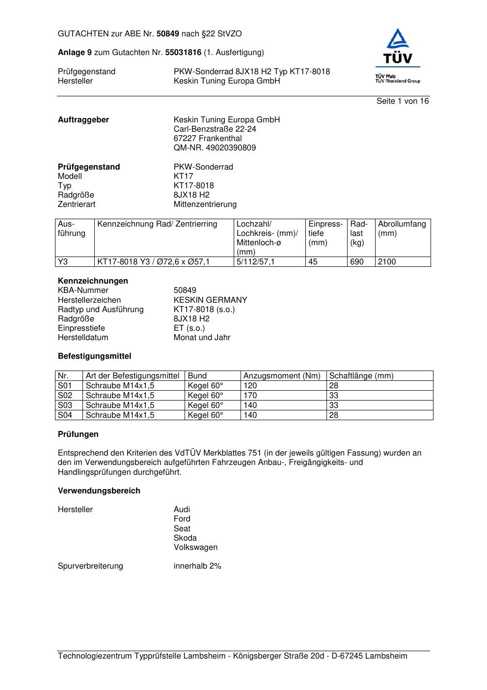 Dieses Gutachten (abe) bezieht sich auf die Alufelge Keskin KT17-8018 in der Ausführung ET 0, Mittenloch 0 mm (KBA 50849). Im PDF findest du typischerweise zulässige Reifengrößen, Auflagen/Anbauhinweise und – je nach Dokument – Hinweise zur Eintragung.