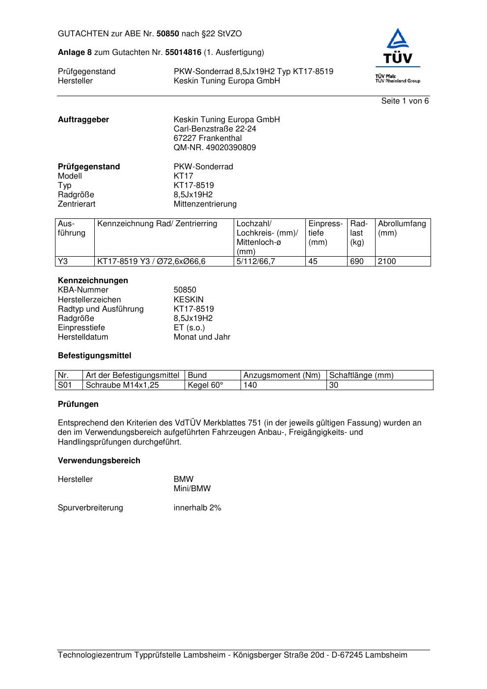 Dieses Gutachten (abe) bezieht sich auf die Alufelge Keskin Tuning Europa GmbH KT17-8519 in der Ausführung ET 0, Mittenloch 0 mm (KBA 50850). Im PDF findest du typischerweise zulässige Reifengrößen, Auflagen/Anbauhinweise und – je nach Dokument – Hinweise zur Eintragung.