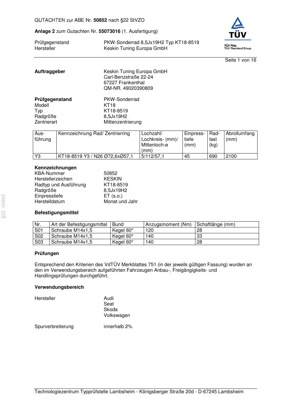 Dieses Gutachten (abe) bezieht sich auf die Alufelge Keskin Tuning Europa GmbH KT18-8519 in der Ausführung ET 0, Mittenloch 0 mm (KBA 50852). Im PDF findest du typischerweise zulässige Reifengrößen, Auflagen/Anbauhinweise und – je nach Dokument – Hinweise zur Eintragung.