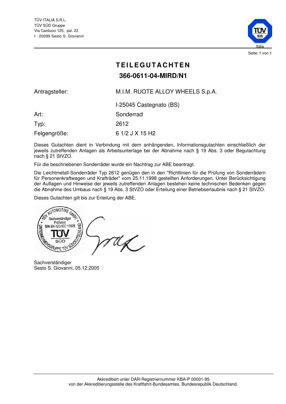 teilegutachten 366-0611-04-mird-n1 M.I.M. RUO TE ALLOY WHEELS S.p.A. Typ: 2612 Felgengröße