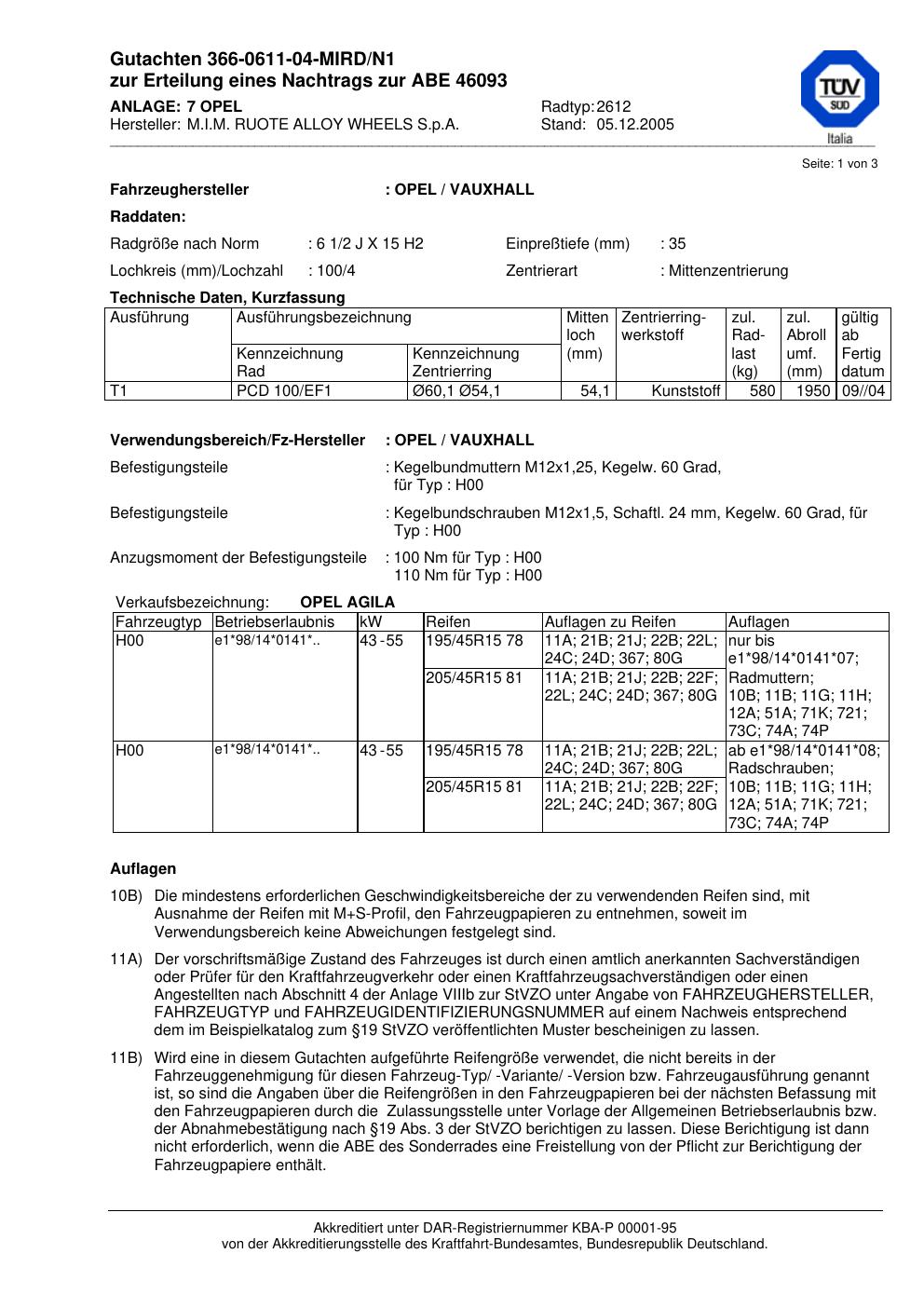 Dieses Gutachten (abe) bezieht sich auf die Alufelge M.I.M. RUOTE ALLOY WH EELS S.p.A. 2612 in der Ausführung ET 0, Mittenloch 0 mm (KBA 46093). Im PDF findest du typischerweise zulässige Reifengrößen, Auflagen/Anbauhinweise und – je nach Dokument – Hinweise zur Eintragung.