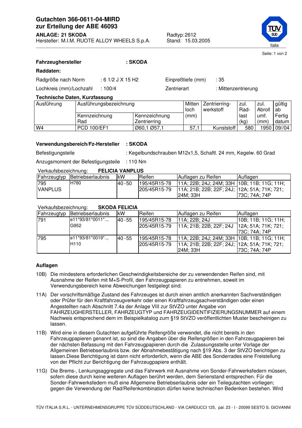 Felgengutachten / abe für Alufelgen M.I.M. RUOTE ALLOY WH EELS S.p.A. 2612 (ET 0, Mittenloch 0 mm) mit KBA 46093 (Zertifikatsnummer 46093). Hier kostenlos als PDF herunterladen. Der Download-Link ist 24 Stunden gültig und kann bis zu zwei Mal verwendet werden.