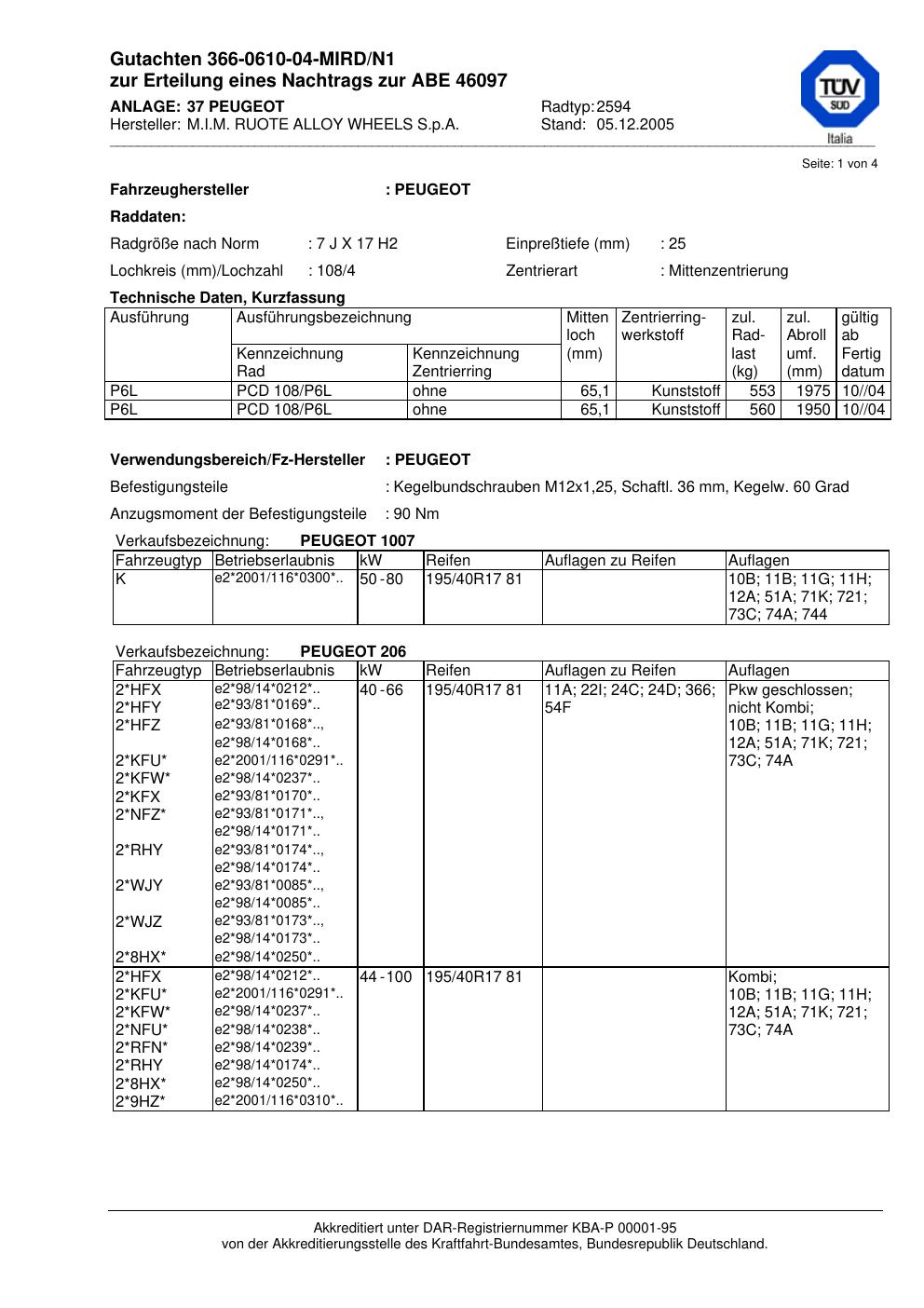 Dieses Gutachten (abe) bezieht sich auf die Alufelge M.I.M. RUOTE ALLOY WH EELS S.p.A. 2594 in der Ausführung ET 0, Mittenloch 0 mm (KBA 46097). Im PDF findest du typischerweise zulässige Reifengrößen, Auflagen/Anbauhinweise und – je nach Dokument – Hinweise zur Eintragung.