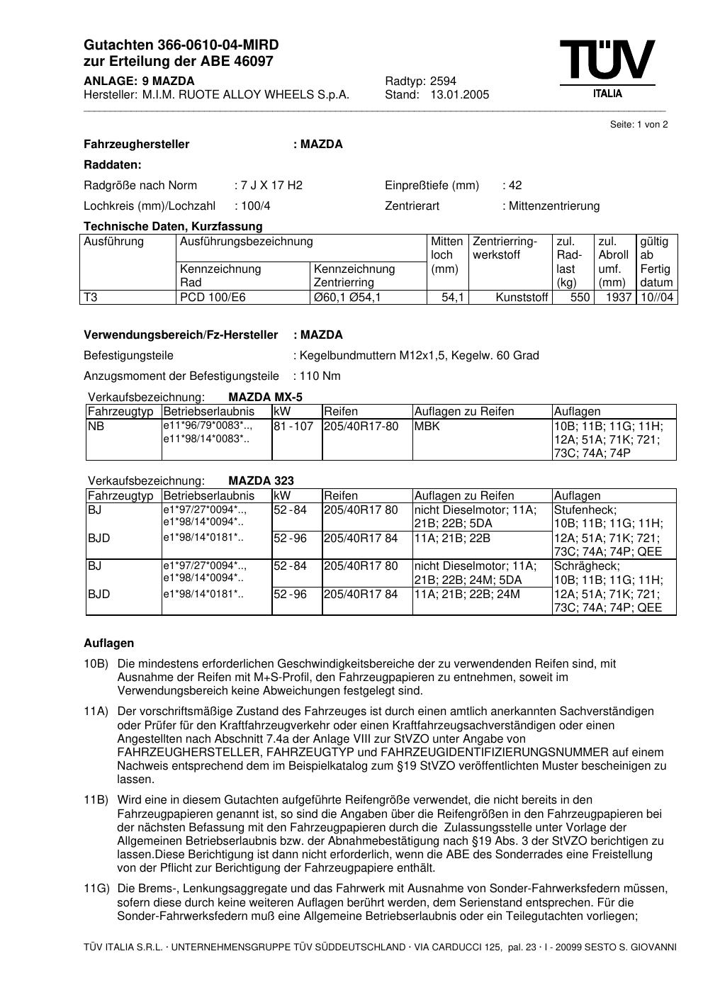 Dieses Gutachten (abe) bezieht sich auf die Alufelge M.I.M. RUOTE ALLOY WHEELS S.p.A. 2594 in der Ausführung ET 0, Mittenloch 0 mm (KBA 46097). Im PDF findest du typischerweise zulässige Reifengrößen, Auflagen/Anbauhinweise und – je nach Dokument – Hinweise zur Eintragung.