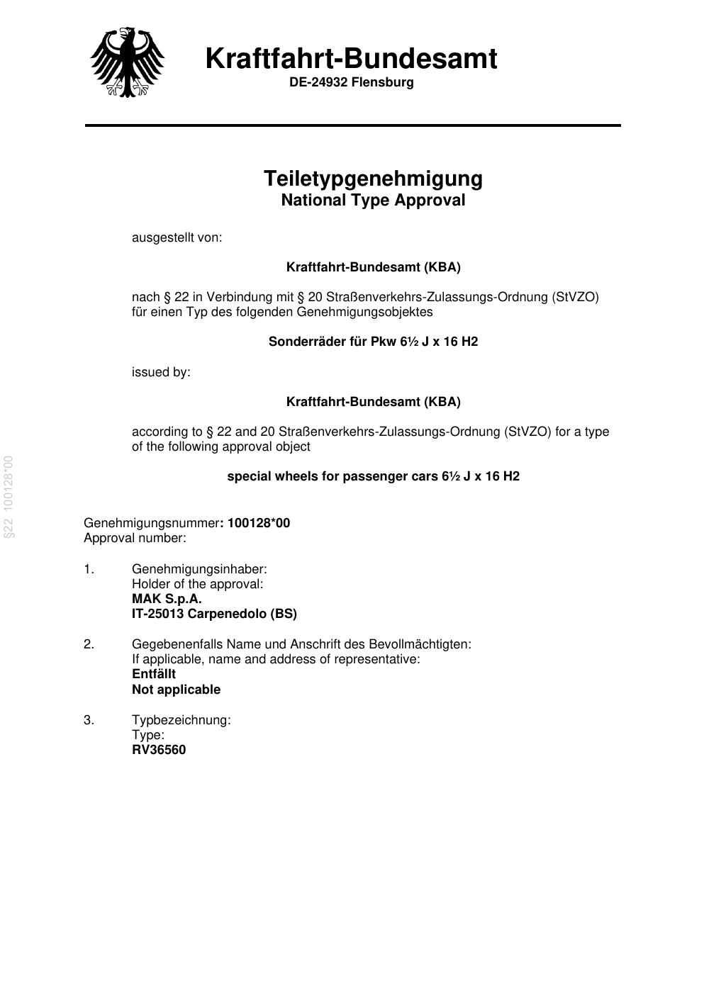 Felgengutachten / teilegutachten für Alufelgen MAK RV36560 (ET 0, Mittenloch 0 mm) (Zertifikatsnummer 100128-00). Hier kostenlos als PDF herunterladen. Der Download-Link ist 24 Stunden gültig und kann bis zu zwei Mal verwendet werden.