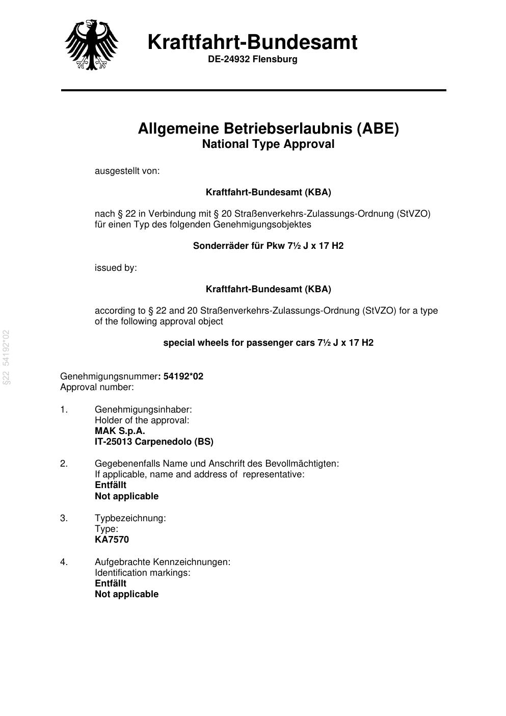 Felgengutachten / abe für Alufelgen MAK S.p.A. KA7570 (ET 0, Mittenloch 0 mm) mit KBA 54192 (Zertifikatsnummer 54192). Hier kostenlos als PDF herunterladen. Der Download-Link ist 24 Stunden gültig und kann bis zu zwei Mal verwendet werden.