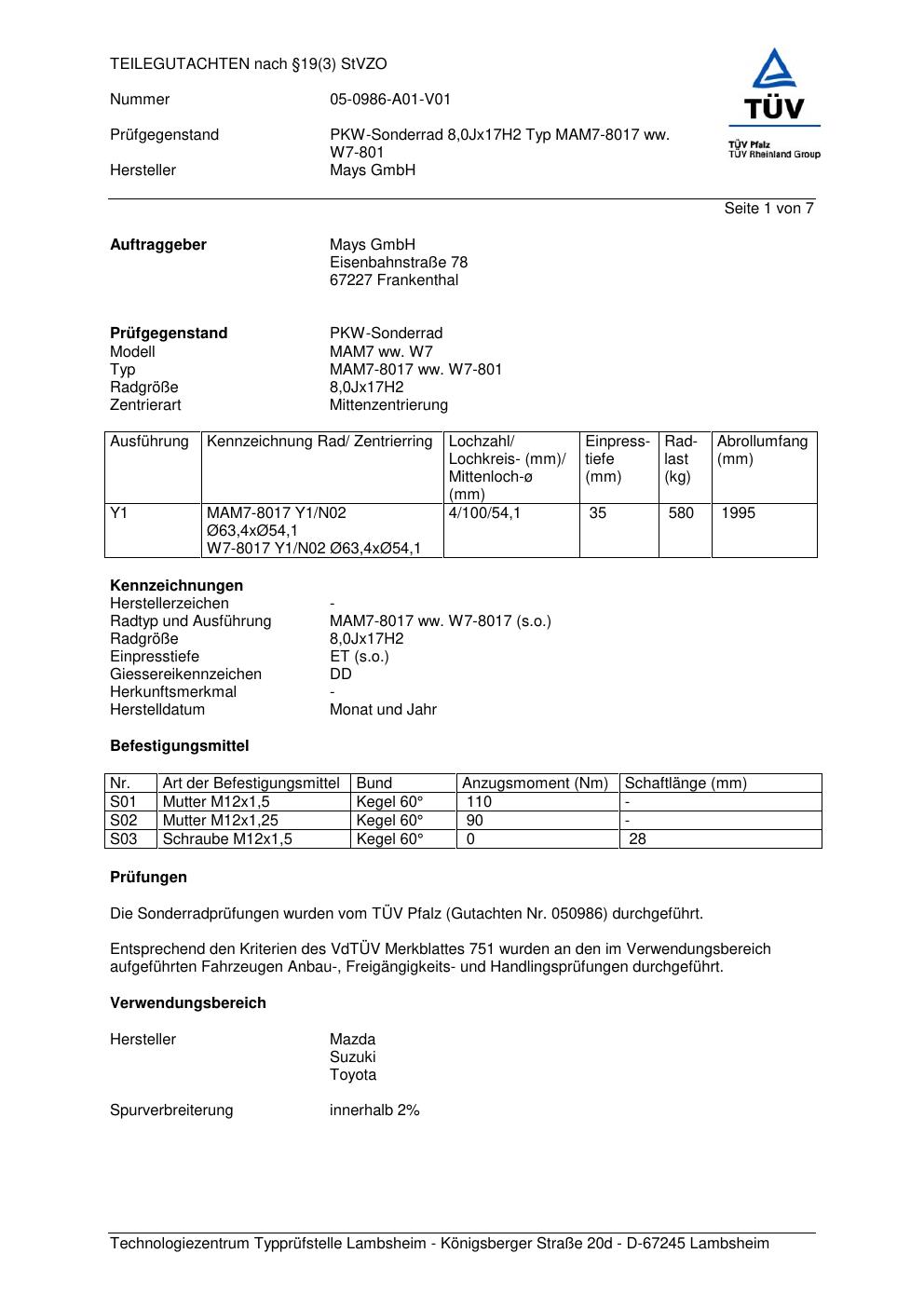 teilegutachten 05-0986-a01-v01 Mays GmbH MAM7-8017