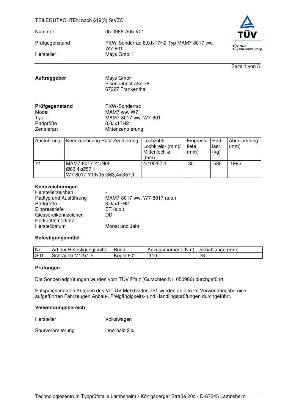 teilegutachten 05-0986-a05-v01 Mays GmbH MAM7-8017