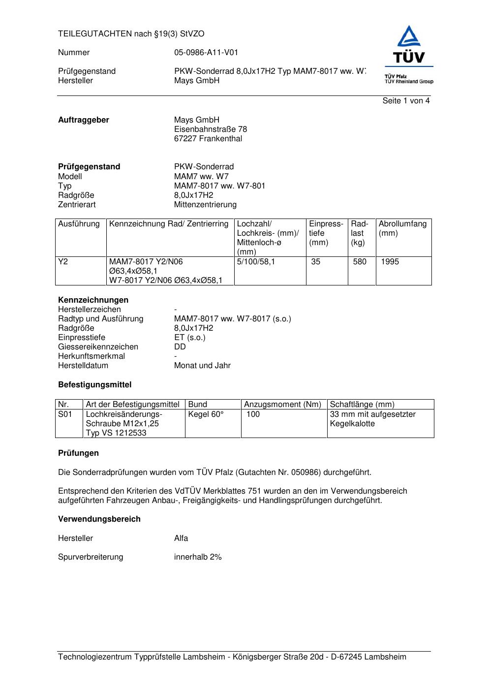 teilegutachten 05-0986-a11-v01 Mays GmbH MAM7-8017