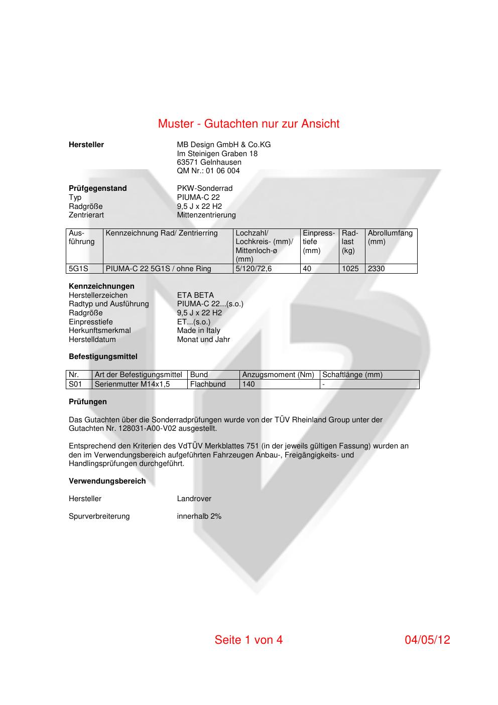 Felgengutachten / teilegutachten für Alufelgen MB Design GmbH & Co.KG PIUMA-C 22 (ET 0, Mittenloch 0 mm) (Zertifikatsnummer 12-0376-a04-v01). Hier kostenlos als PDF herunterladen. Der Download-Link ist 24 Stunden gültig und kann bis zu zwei Mal verwendet werden.