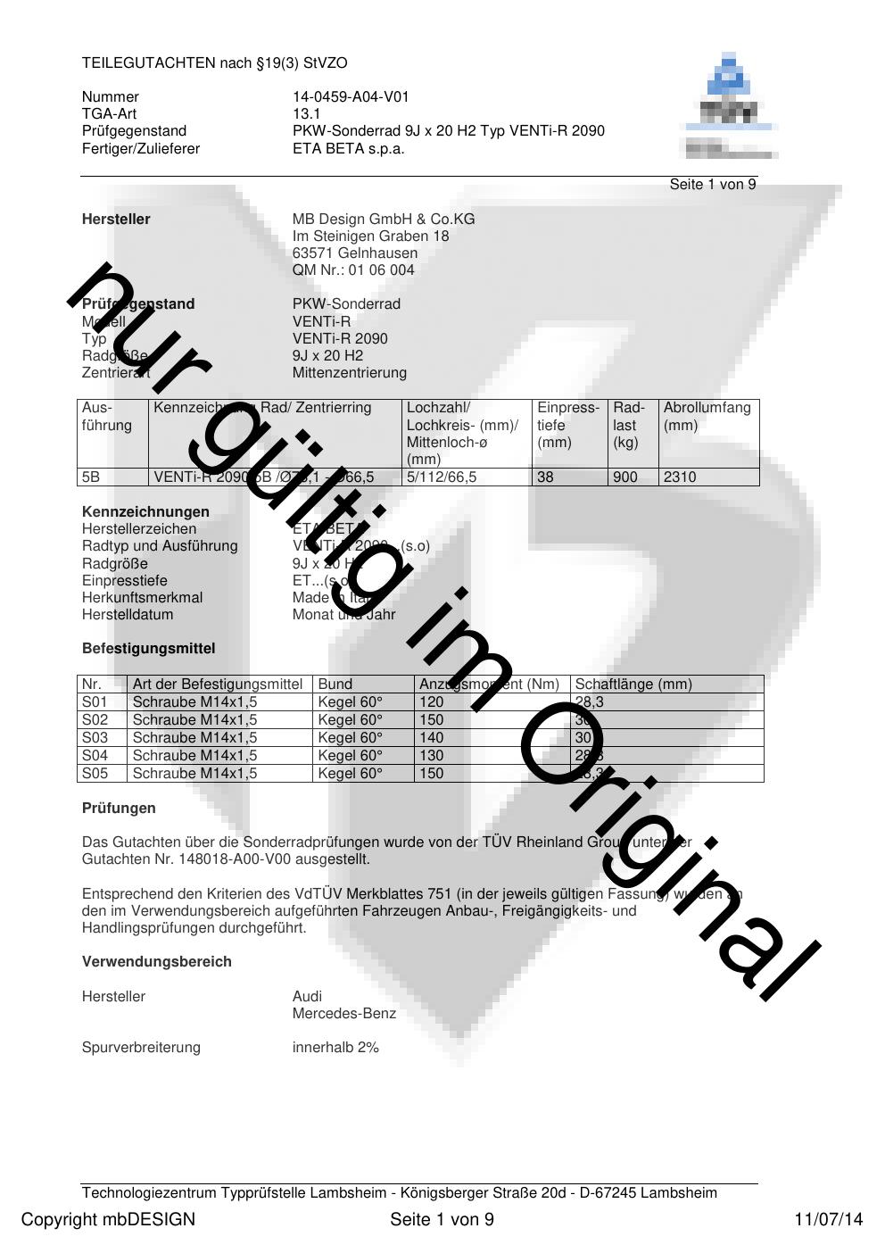 teilegutachten 14-0459-a04-v01 MB Design GmbH & Co.KG (Fertiger/Zulieferer: ETA BETA s.p.a.) VENTi-R 2090