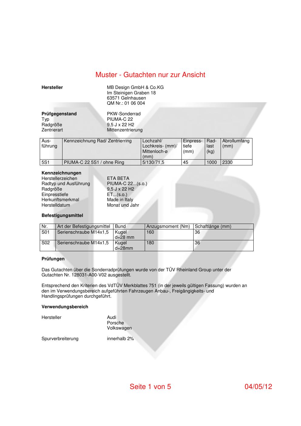 Felgengutachten / teilegutachten für Alufelgen MB Design GmbH & Co.KG PIUMA-C 22 (ET 0, Mittenloch 0 mm) (Zertifikatsnummer 12-0376-a05-v01). Hier kostenlos als PDF herunterladen. Der Download-Link ist 24 Stunden gültig und kann bis zu zwei Mal verwendet werden.