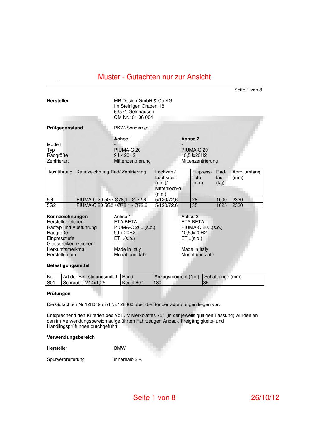 Felgengutachten / teilegutachten für Alufelgen MB Design GmbH & Co.KG PIUMA-C 20 (ET 0, Mittenloch 0 mm) (Zertifikatsnummer 128049). Hier kostenlos als PDF herunterladen. Der Download-Link ist 24 Stunden gültig und kann bis zu zwei Mal verwendet werden.