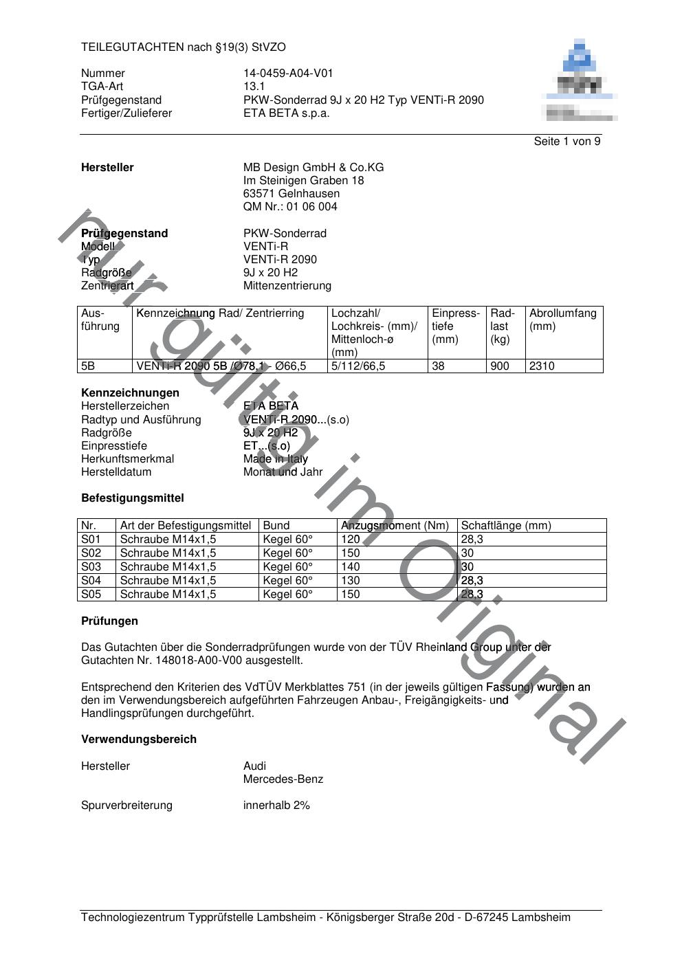 teilegutachten 14-0459-a04-v01 MB Design GmbH & Co.KG VENTi-R 2090