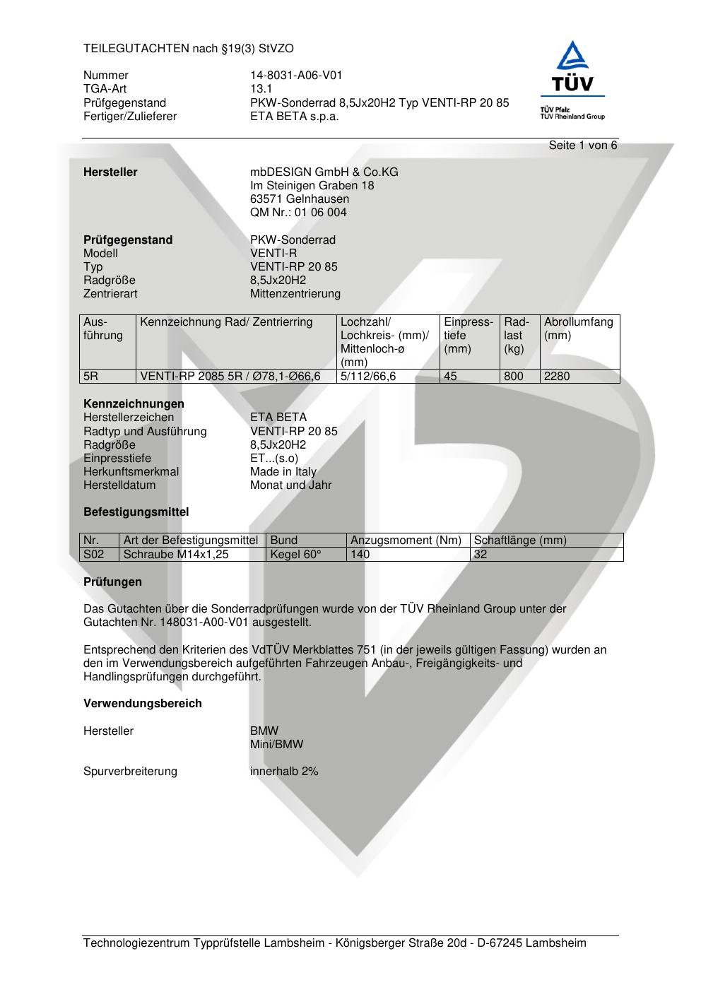 teilegutachten 14-8031-a06-v01 mbDESIGN GmbH & Co. KG VENTI-RP 20 85