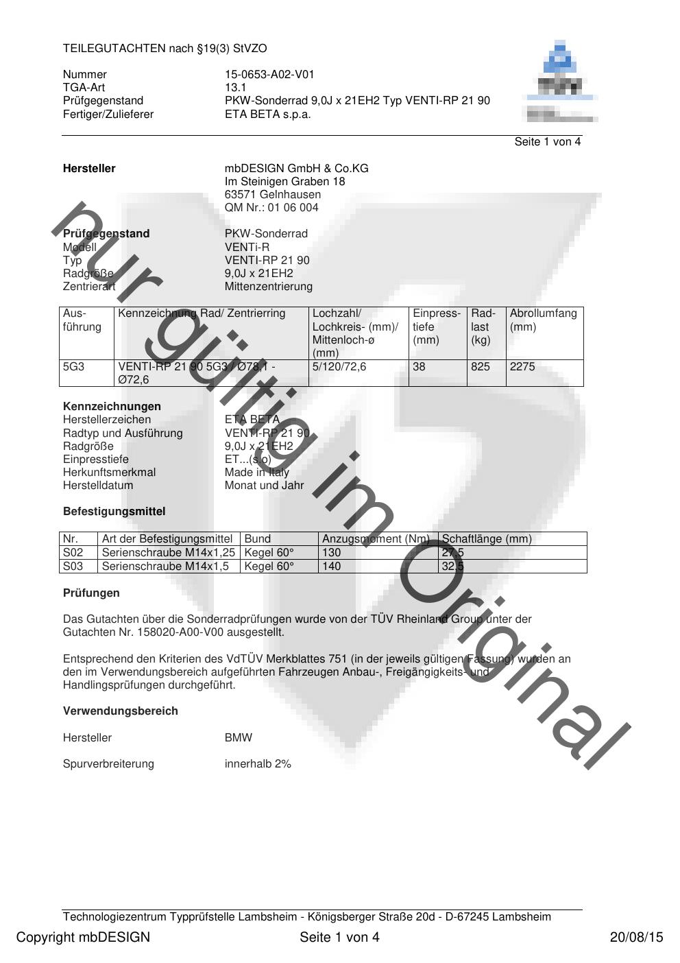 teilegutachten 158020-a00-v00 mbDESIGN GmbH & Co. KG VENTI-RP 21 90