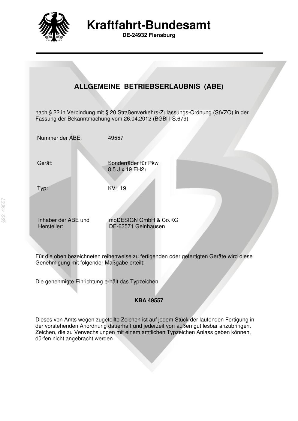 Dieses Gutachten (abe) bezieht sich auf die Alufelge mbDESIGN GmbH & Co. KG KV1 19 in der Ausführung ET 0, Mittenloch 0 mm (KBA 49557). Im PDF findest du typischerweise zulässige Reifengrößen, Auflagen/Anbauhinweise und – je nach Dokument – Hinweise zur Eintragung.