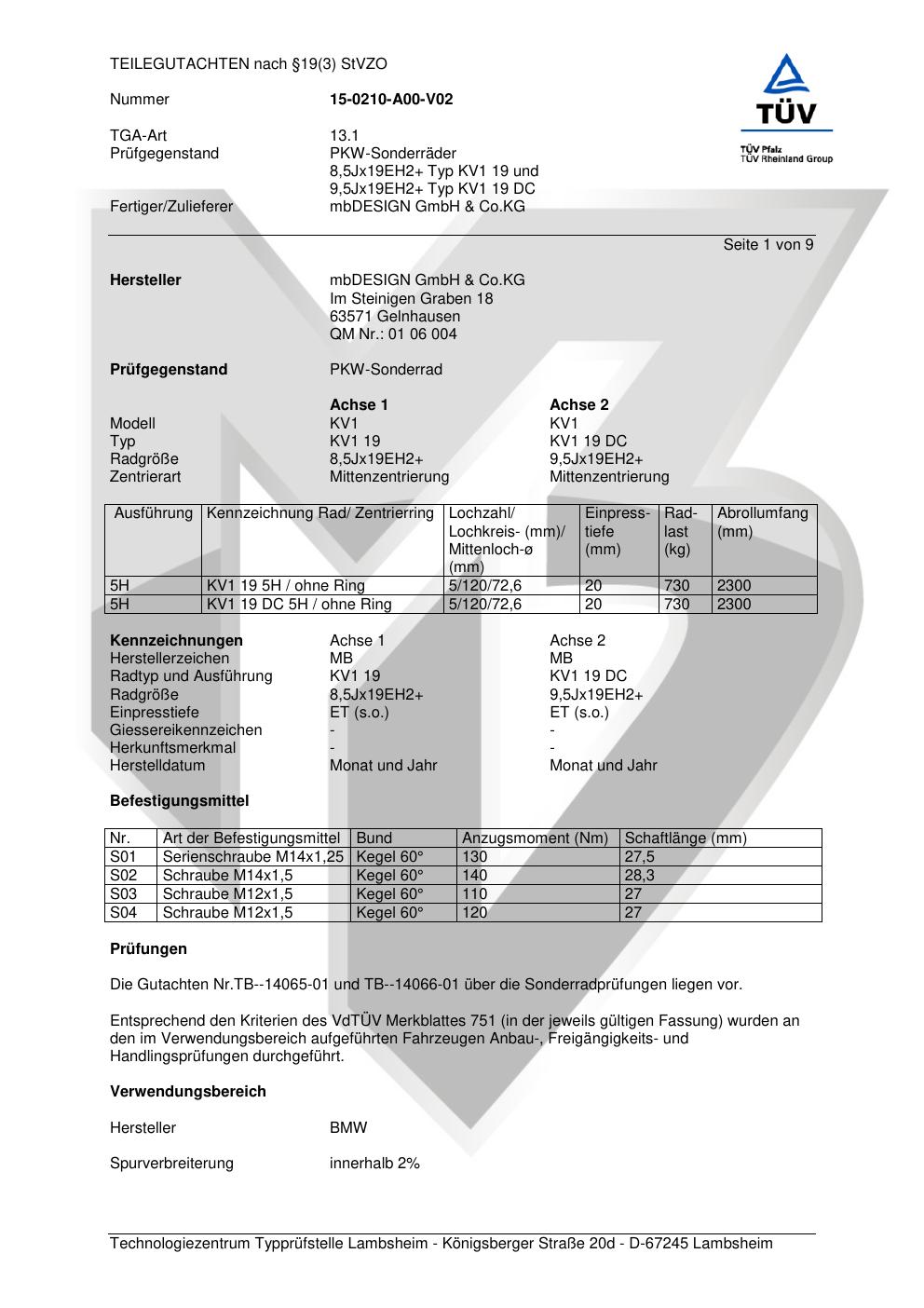 teilegutachten 15-0210-a00-v02 mbDESIGN GmbH & Co. KG KV1 19; KV1 19 DC
