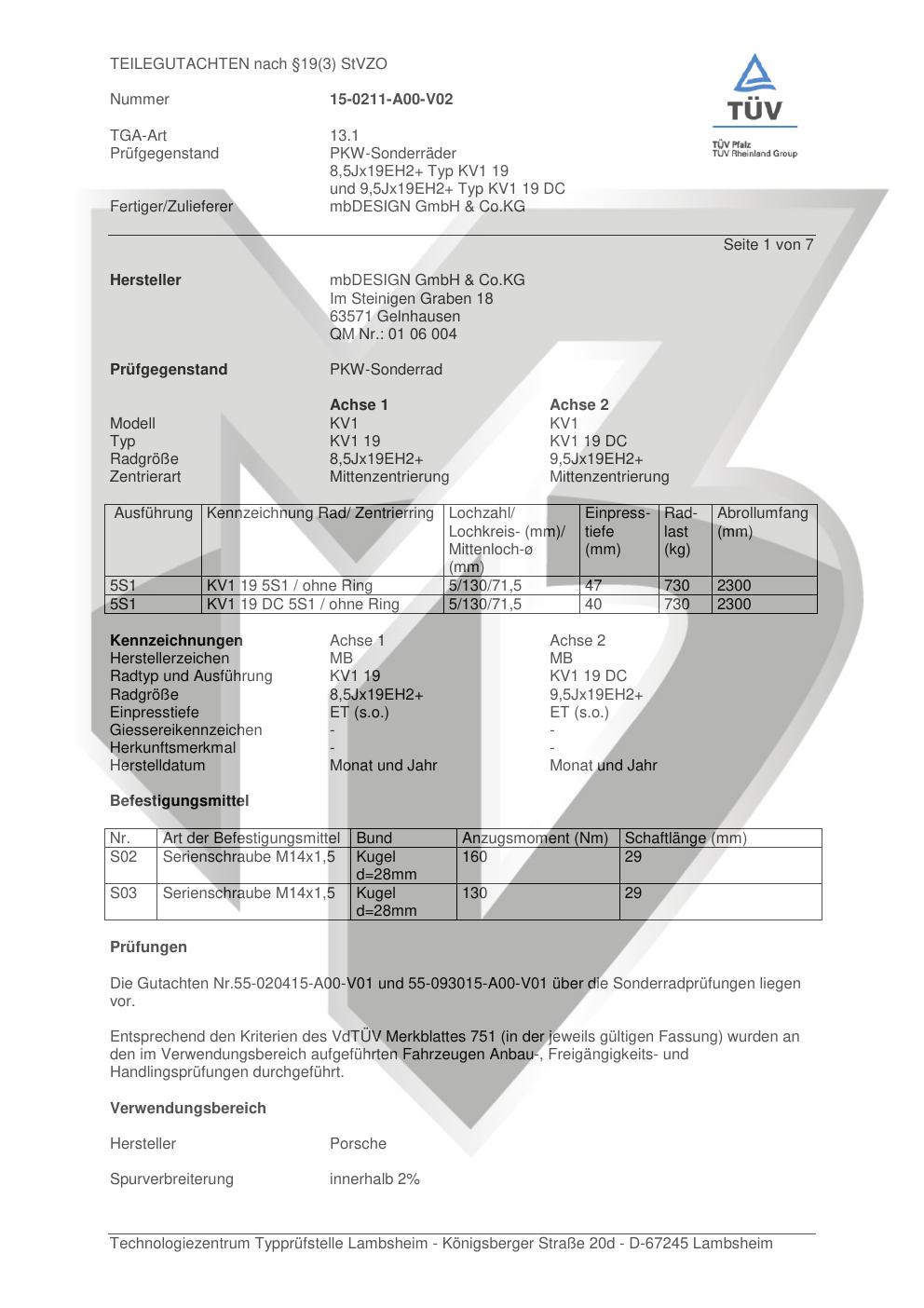 teilegutachten 15-0211-a00-v02 mbDESIGN GmbH & Co. KG KV1 19; KV1 19 DC