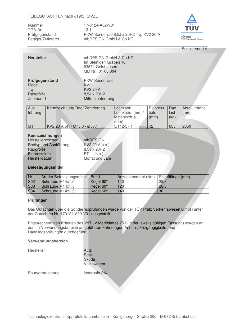 teilegutachten 17-0124-a02-v01 mbDESIGN GmbH & Co. KG KV2 20 A