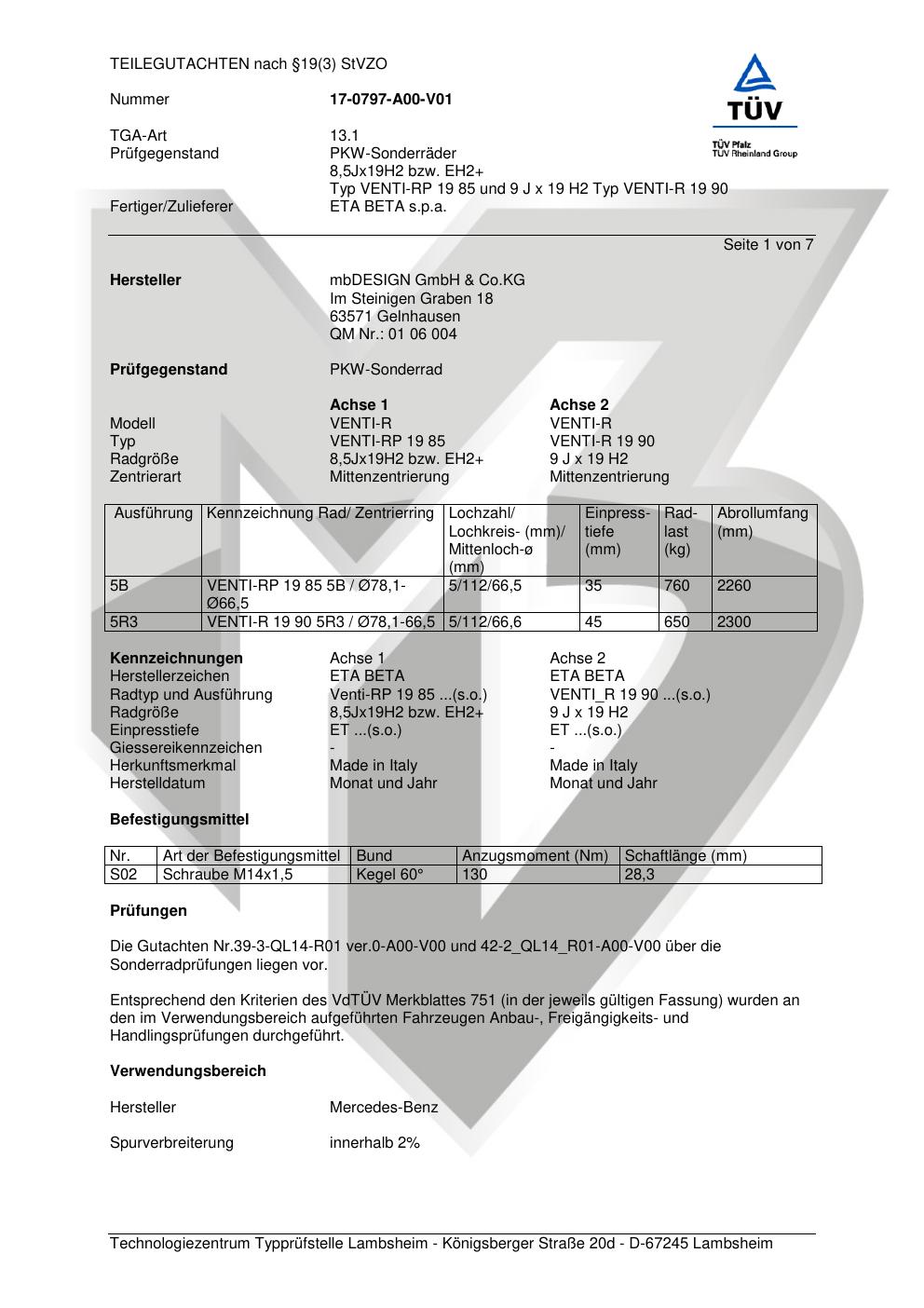 teilegutachten 17-0797-a00-v01 mbDESIGN GmbH & Co. KG VENTI-RP