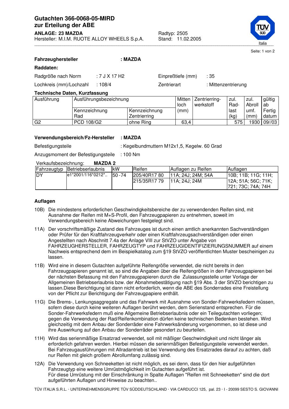 teilegutachten 366-0068-05-mird M.I.M. RUOTE ALLOY WHEELS S.p.A. 2505