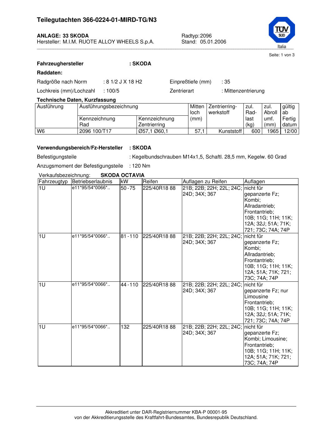 Dieses Gutachten (teilegutachten) bezieht sich auf die Alufelge MIM 2096 in der Ausführung ET 0, Mittenloch 0 mm . Im PDF findest du typischerweise zulässige Reifengrößen, Auflagen/Anbauhinweise und – je nach Dokument – Hinweise zur Eintragung.