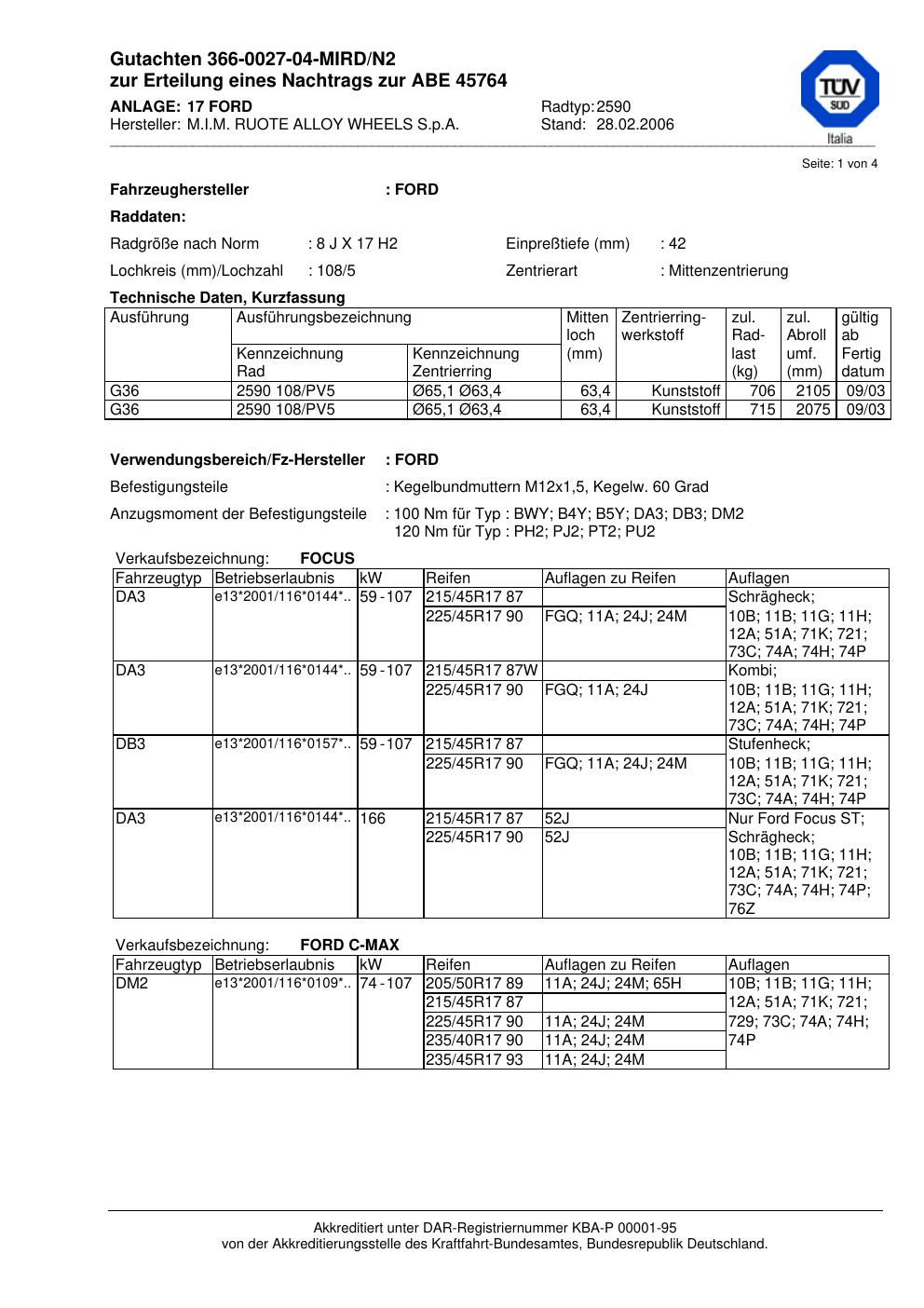 Dieses Gutachten (abe) bezieht sich auf die Alufelge M.I.M. RUOTE ALLOY WHEELS S.p.A. 2590 in der Ausführung ET 0, Mittenloch 0 mm (KBA 45764). Im PDF findest du typischerweise zulässige Reifengrößen, Auflagen/Anbauhinweise und – je nach Dokument – Hinweise zur Eintragung.
