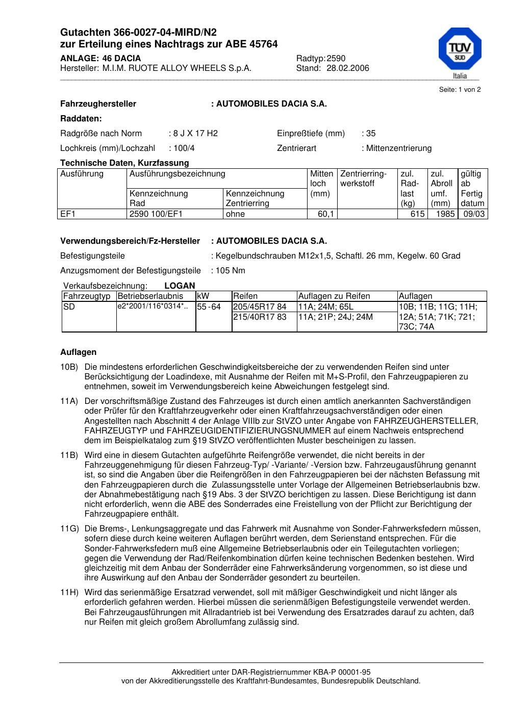Dieses Gutachten (abe) bezieht sich auf die Alufelge M.I.M. RUOTE ALLOY WHEELS S.p.A. 2590 in der Ausführung ET 0, Mittenloch 0 mm (KBA 45764). Im PDF findest du typischerweise zulässige Reifengrößen, Auflagen/Anbauhinweise und – je nach Dokument – Hinweise zur Eintragung.