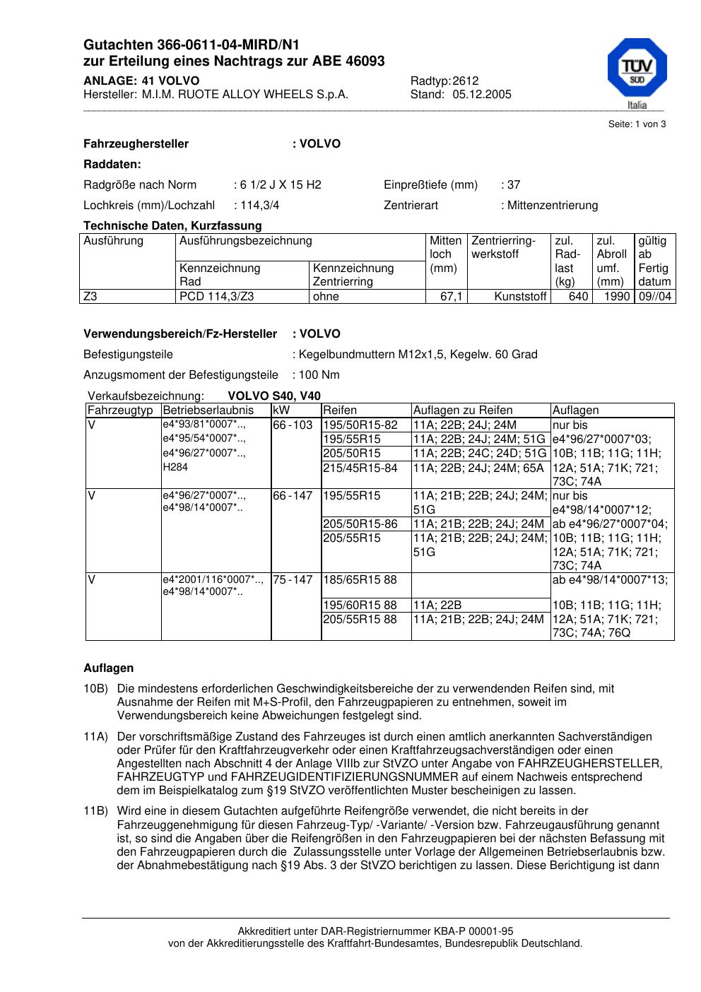 Dieses Gutachten (abe) bezieht sich auf die Alufelge M.I.M. RUOTE ALLOY WHEELS S.p.A. 2612 in der Ausführung ET 0, Mittenloch 0 mm (KBA 46093). Im PDF findest du typischerweise zulässige Reifengrößen, Auflagen/Anbauhinweise und – je nach Dokument – Hinweise zur Eintragung.