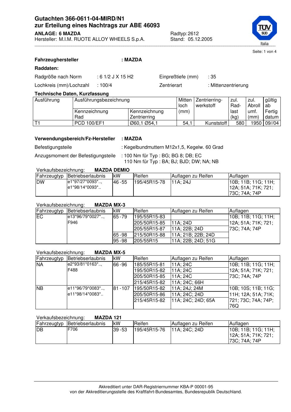 Dieses Gutachten (abe) bezieht sich auf die Alufelge M.I.M. RUOTE ALLOY WHEELS S.p.A. 2612 in der Ausführung ET 0, Mittenloch 0 mm (KBA 46093). Im PDF findest du typischerweise zulässige Reifengrößen, Auflagen/Anbauhinweise und – je nach Dokument – Hinweise zur Eintragung.