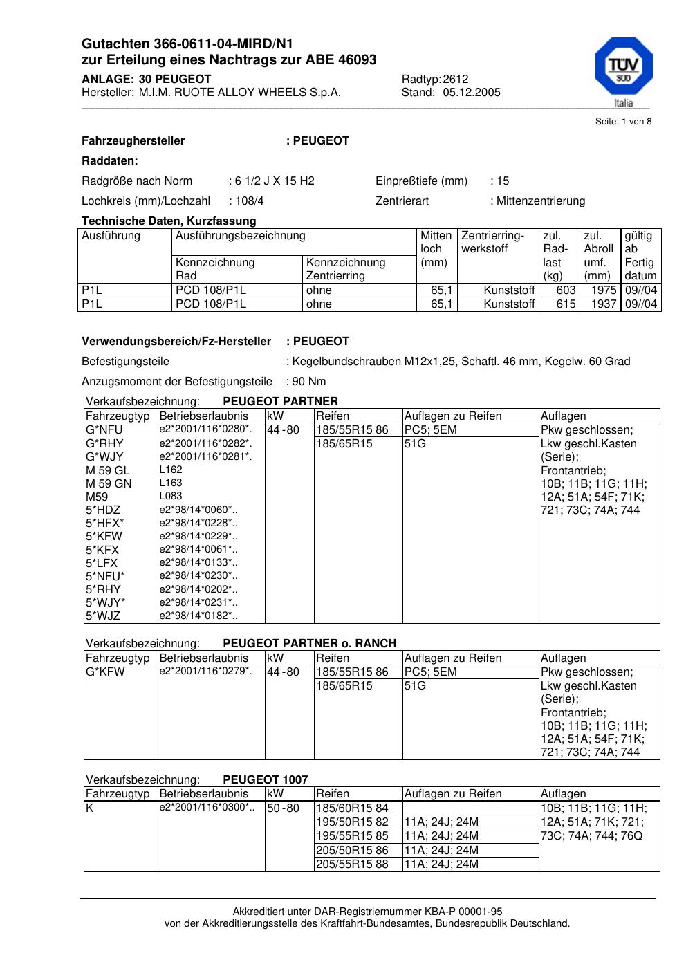 Dieses Gutachten (abe) bezieht sich auf die Alufelge M.I.M. RUOTE ALLOY WHEELS S.p.A. 2612 in der Ausführung ET 0, Mittenloch 0 mm (KBA 46093). Im PDF findest du typischerweise zulässige Reifengrößen, Auflagen/Anbauhinweise und – je nach Dokument – Hinweise zur Eintragung.
