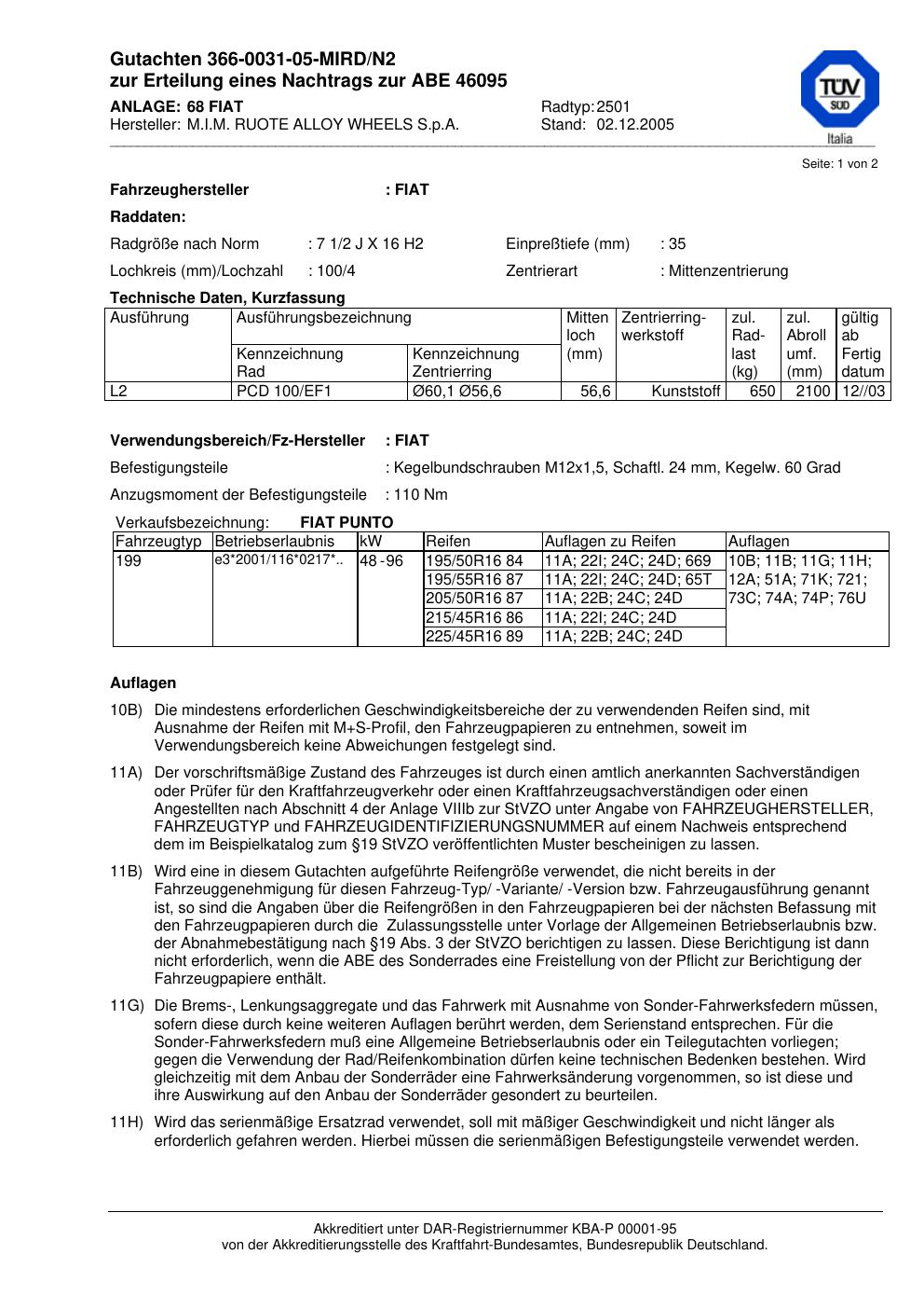 Dieses Gutachten (abe) bezieht sich auf die Alufelge M.I.M. RUOTE ALLOY WHEELS S.p.A. 2501 in der Ausführung ET 0, Mittenloch 0 mm (KBA 46095). Im PDF findest du typischerweise zulässige Reifengrößen, Auflagen/Anbauhinweise und – je nach Dokument – Hinweise zur Eintragung.