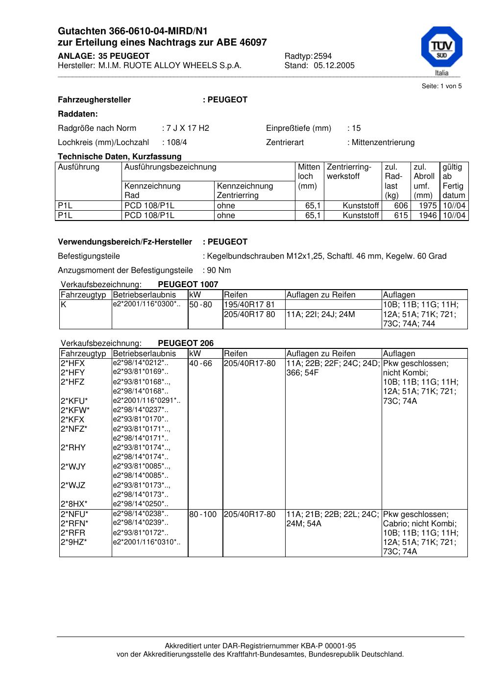 Dieses Gutachten (abe) bezieht sich auf die Alufelge M.I.M. RUOTE ALLOY WHEELS S.p.A. 2594 in der Ausführung ET 0, Mittenloch 0 mm (KBA 46097). Im PDF findest du typischerweise zulässige Reifengrößen, Auflagen/Anbauhinweise und – je nach Dokument – Hinweise zur Eintragung.