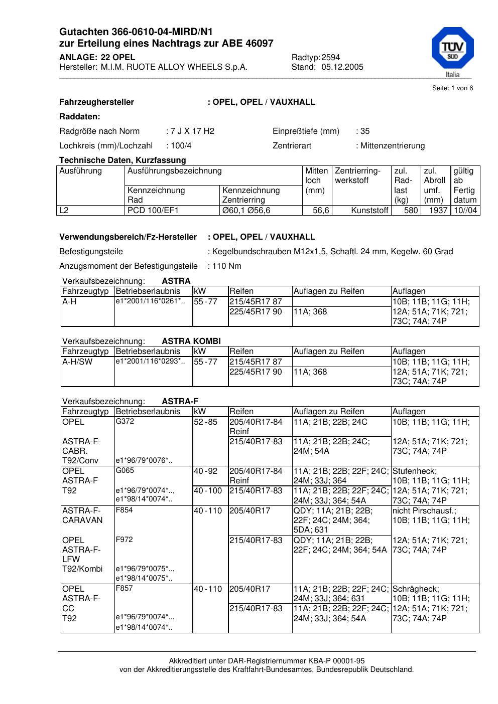 Dieses Gutachten (abe) bezieht sich auf die Alufelge M.I.M. RUOTE ALLOY WHEELS S.p.A. 2594 in der Ausführung ET 0, Mittenloch 0 mm (KBA 46097). Im PDF findest du typischerweise zulässige Reifengrößen, Auflagen/Anbauhinweise und – je nach Dokument – Hinweise zur Eintragung.
