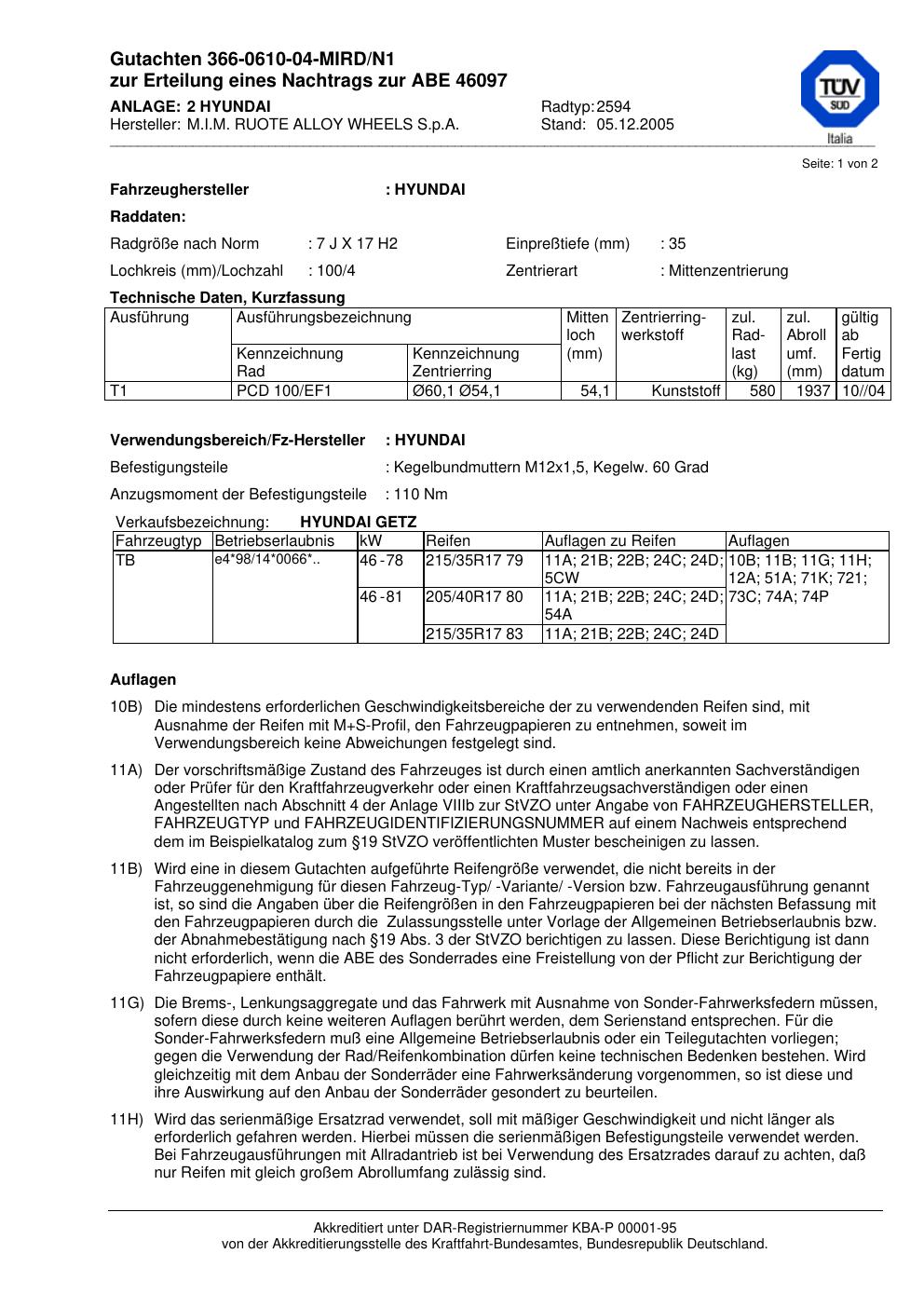 Dieses Gutachten (abe) bezieht sich auf die Alufelge M.I.M. RUOTE ALLOY WH EELS S.p.A. 2594 in der Ausführung ET 0, Mittenloch 0 mm (KBA 46097). Im PDF findest du typischerweise zulässige Reifengrößen, Auflagen/Anbauhinweise und – je nach Dokument – Hinweise zur Eintragung.